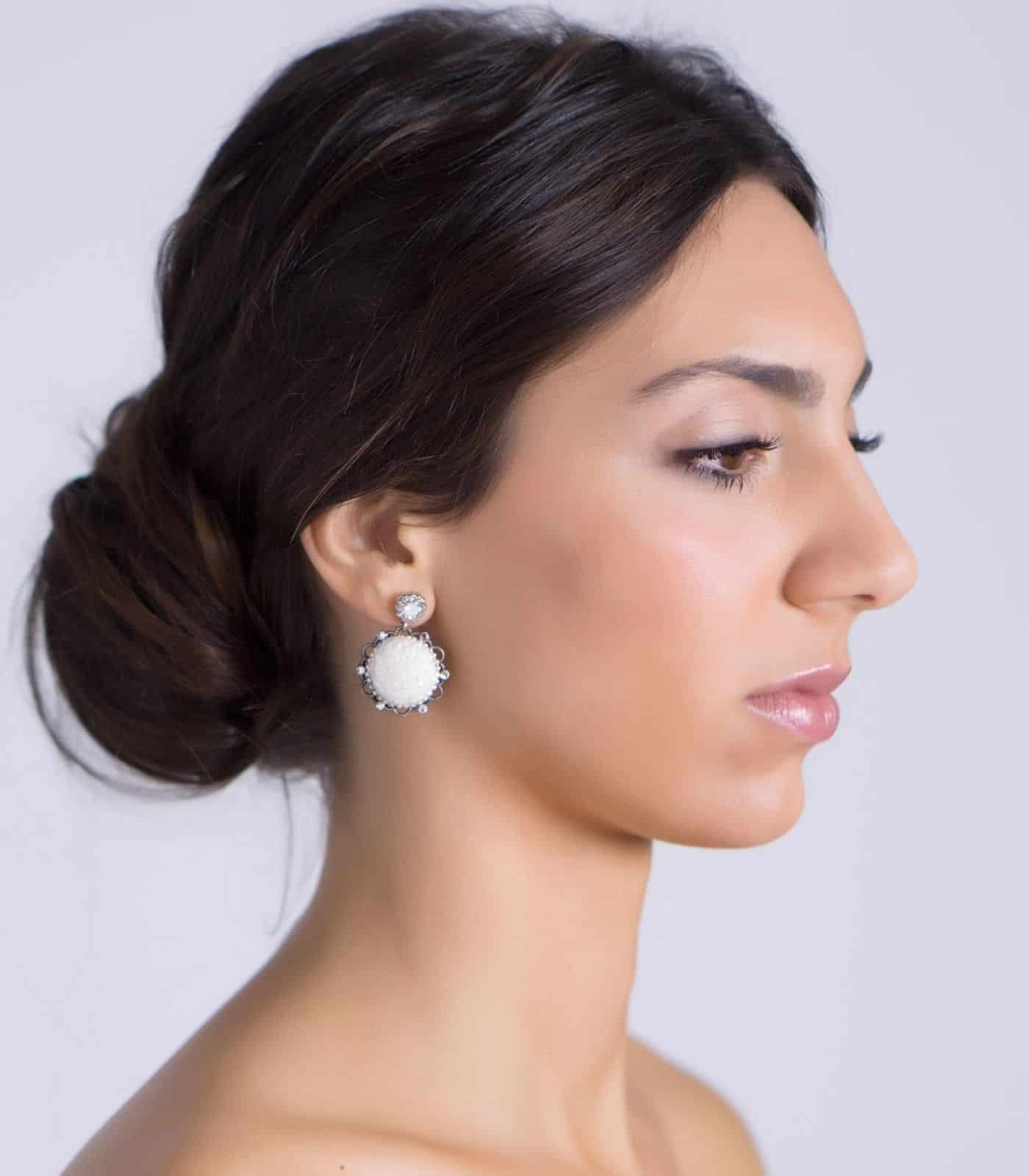 Sencillos pendientes con tacha redonda de nácar y cristal Swarovski. La pieza está formada de una figura redonda de nácar sobre fornitura metálica. Acompañan al pendiente cristal Swarovski. Ideales para las incondicionales de los pendientes pequeños. Reflejan sencillez y elegancia. Combinables con cualquier tipo de vestido de novia.