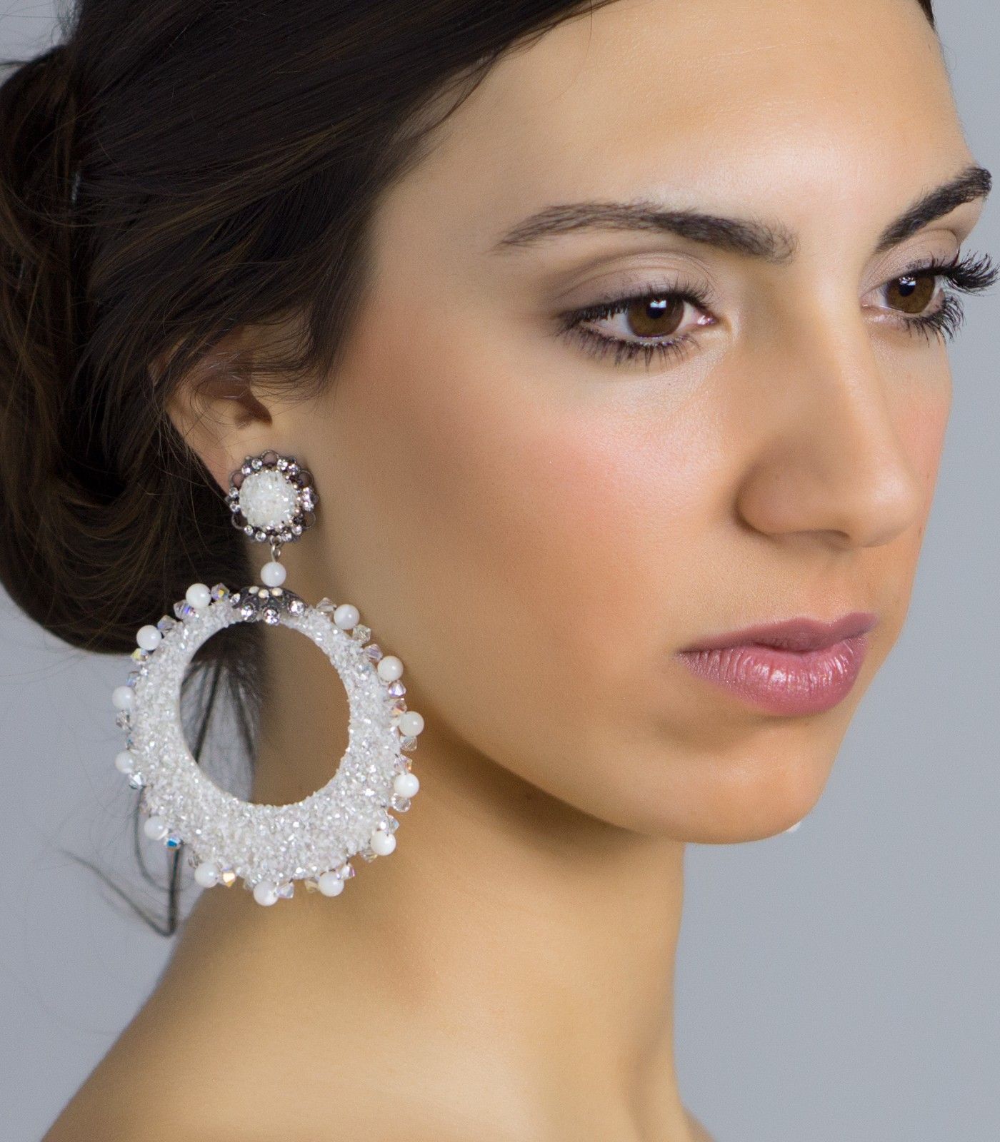 Majestuoso pendiente de novia en forma de aro con nácar. La tacha de nácar contiene cristal de Swarovski. Para las novias amante de los aros esta pieza las hará sentirse única en día irrepetible.