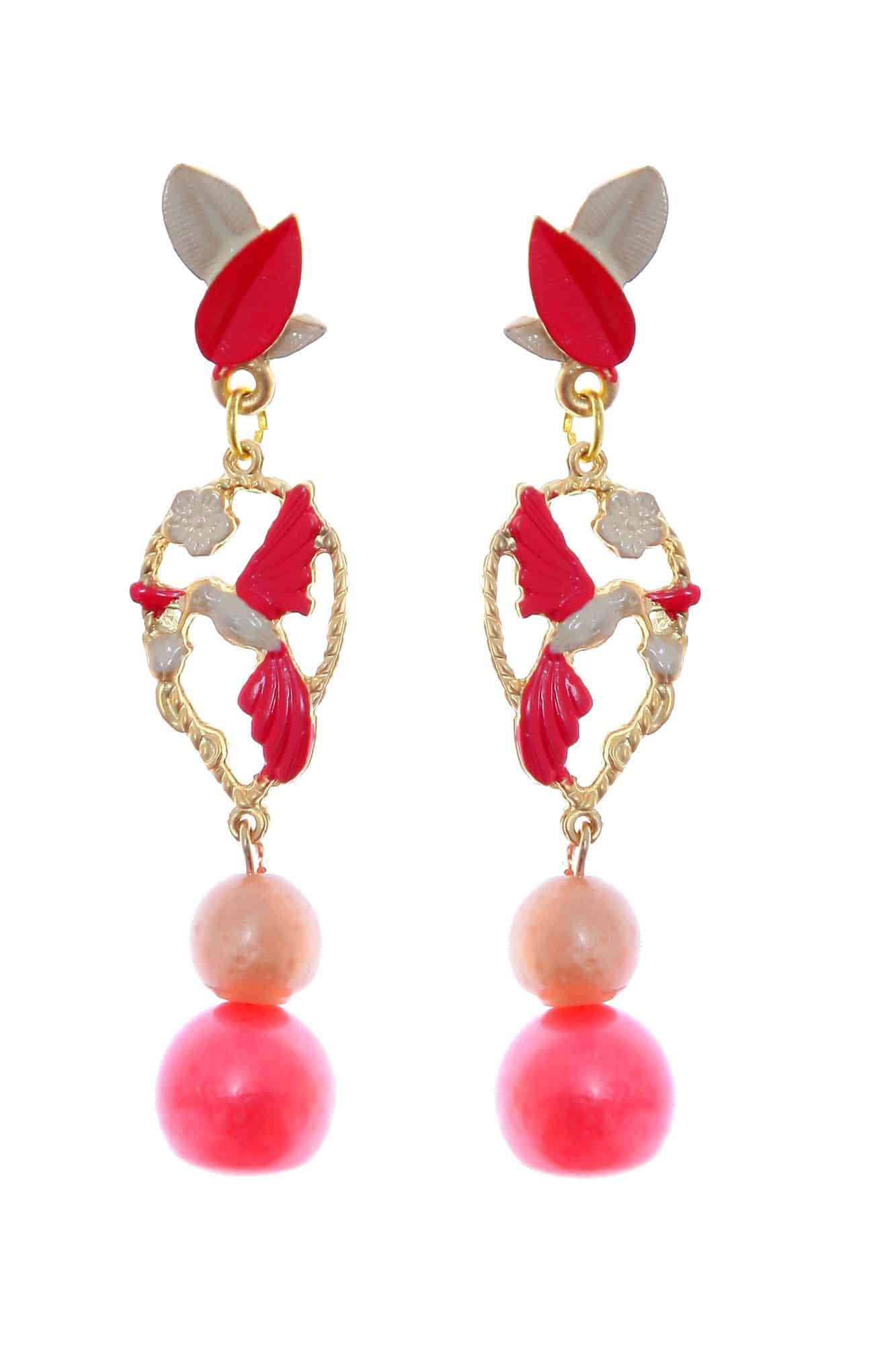 Pendiente dorado de dos círculos labrados, esfera final roja y aplique rojo en forma de flor.