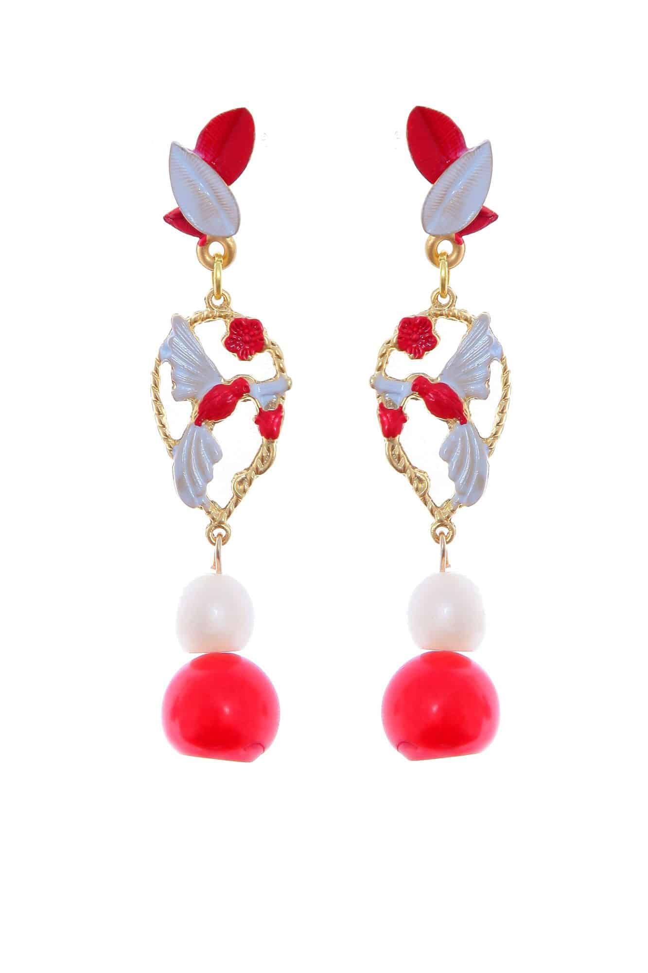 Pendientes en oro mate pintado a mano en blanco y rojo. Cierre de tornillo. Medidas aproximadas ancho x largo, 1,5 x 8,5 cm (con cabezal). Fabricado artesanalmente en la provincia de Sevilla.