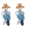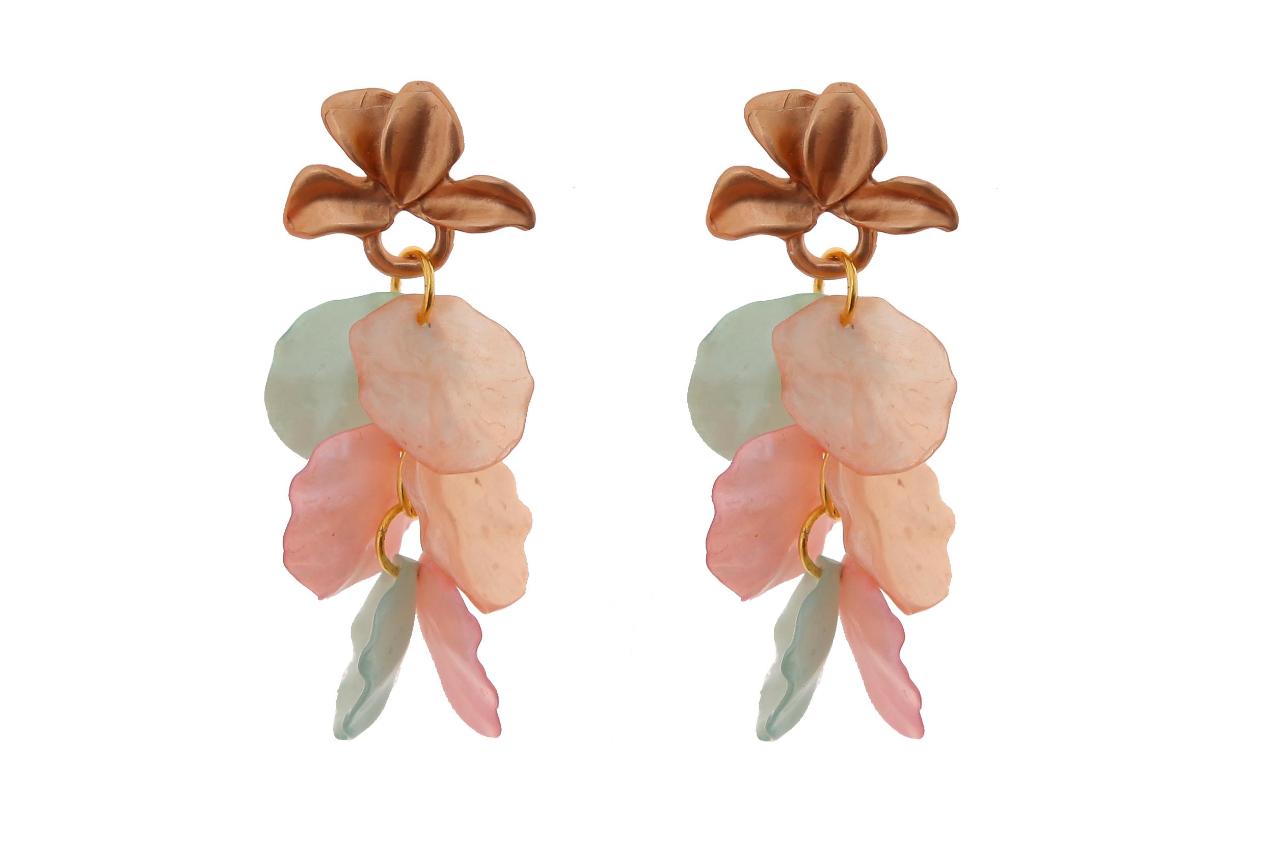 Pendientes de pétalos beige, verde jabonoso y rosa palo con cabezal en forma de hojas