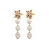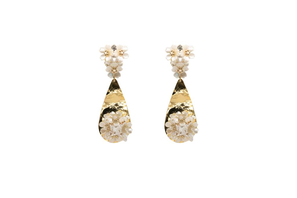 Pendientes dorados en forma de lágrima con cabezal con tres flores blancas