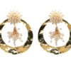 Pendientes largos con cabezal en forma de flor dorada con acabado brillante. Diseño colgante compuesto por dos esferas decoradas con pequeñas perlas blancas y una pieza inferior ovalada de acabado satinado en tono perla. Cierre de tornillo. Medidas aproximadas: 2,2 x 10 cm (con cabezal incluido).