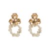 Pendientes largos con cabezal en forma de flor dorada con acabado brillante. Diseño colgante compuesto por dos esferas decoradas con pequeñas perlas blancas y una pieza inferior ovalada de acabado satinado en tono perla. Cierre de tornillo. Medidas aproximadas: 2,2 x 10 cm (con cabezal incluido).