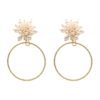 Pendientes largos con cabezal en forma de flor blanca con pétalos nacarados. Diseño compuesto por tres colgantes: dos piezas ovaladas doradas con grabados geométricos y una esfera central formada por pequeñas perlas blancas. Cierre omega. Medidas aproximadas: 2,3 x 13 cm (con cabezal incluido).