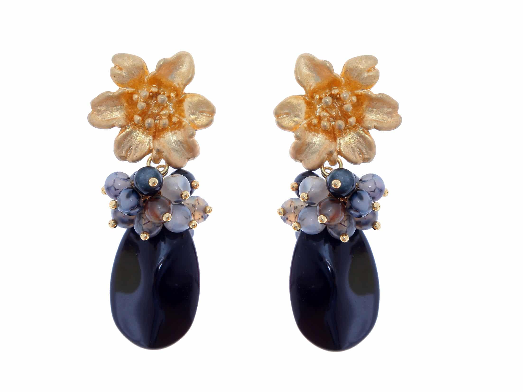 Pendientes negros con cabezal de flor y bolas de piedra Ágata en blanco y negro
