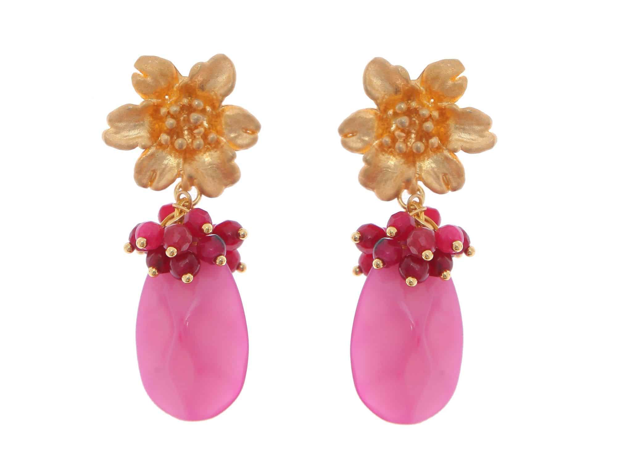 Pendientes rosas con cabezal de flor y bolas de piedra Ágata en tonos rosas