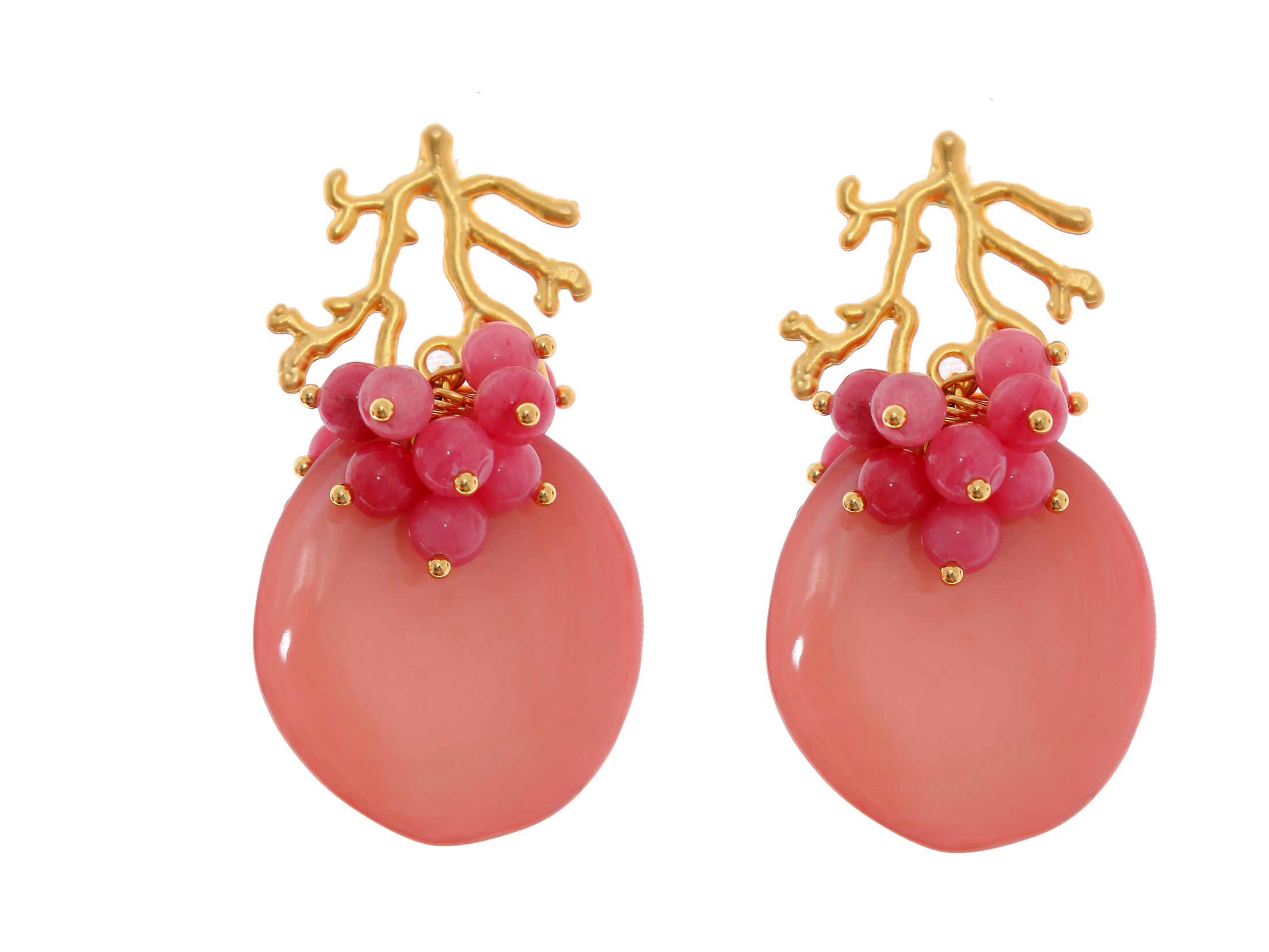 Pendientes rosas maquillaje con bolas de piedra Ágata en rosa bebé y cabezal de coral
