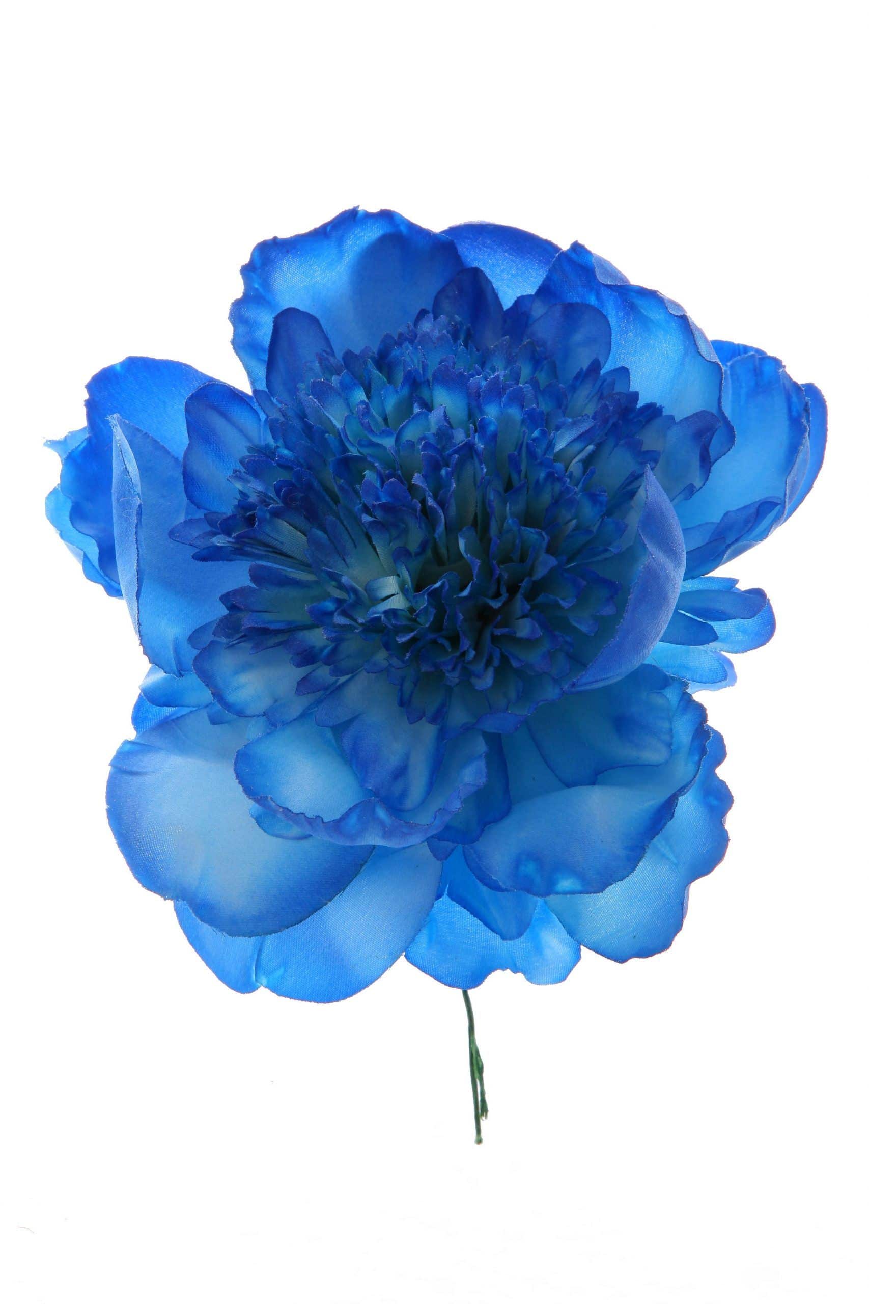 Peonia de flamenca rizada color azulina, de tamaño grande, con un diámetro aproximado de 16 cms. Elaborada artesanalmente en Sevilla.