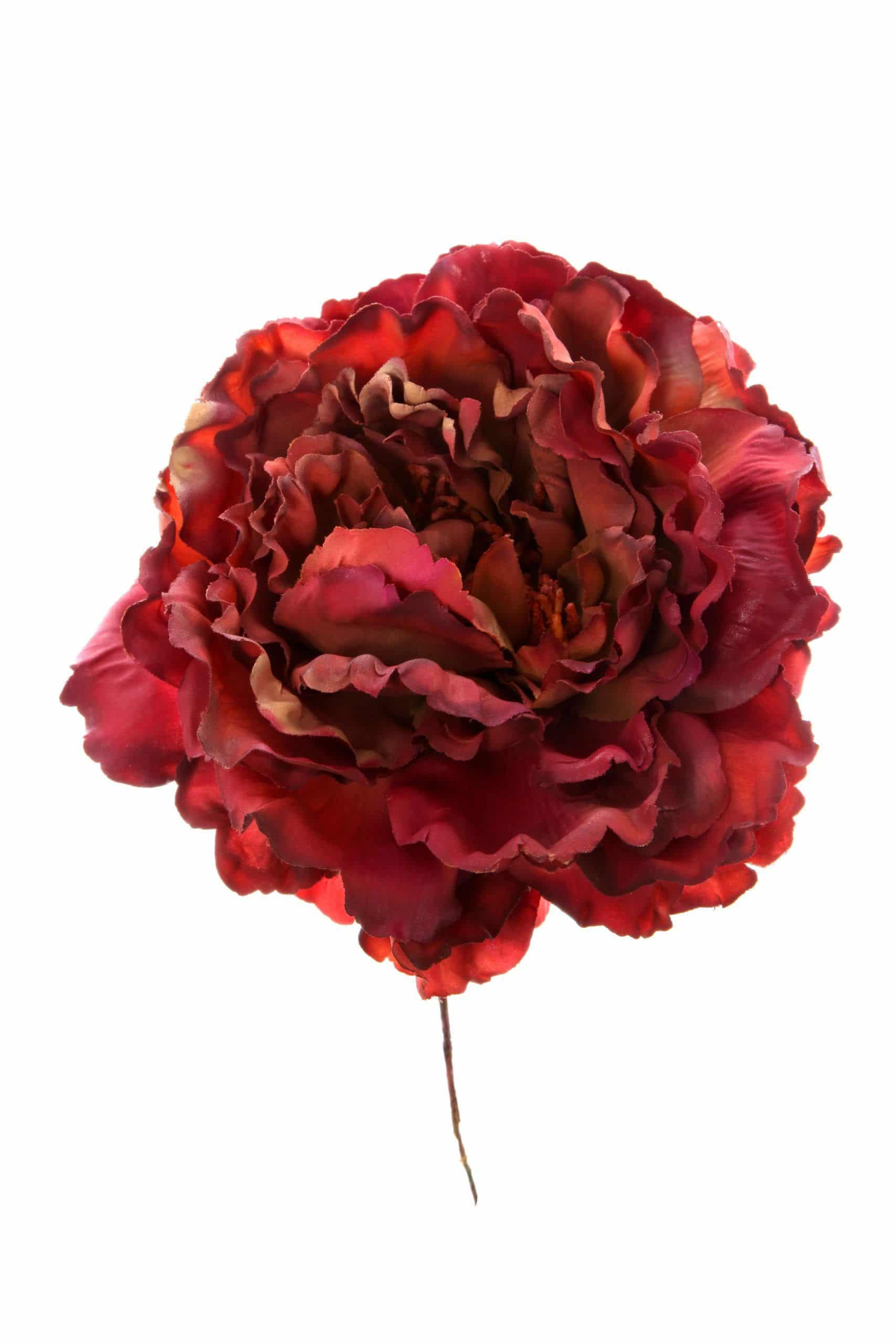 Peonia rizada color maquillaje oscuro, de tamaño grande, con un diámetro aproximado de 16 cms. Elaborada artesanalmente en Sevilla.