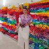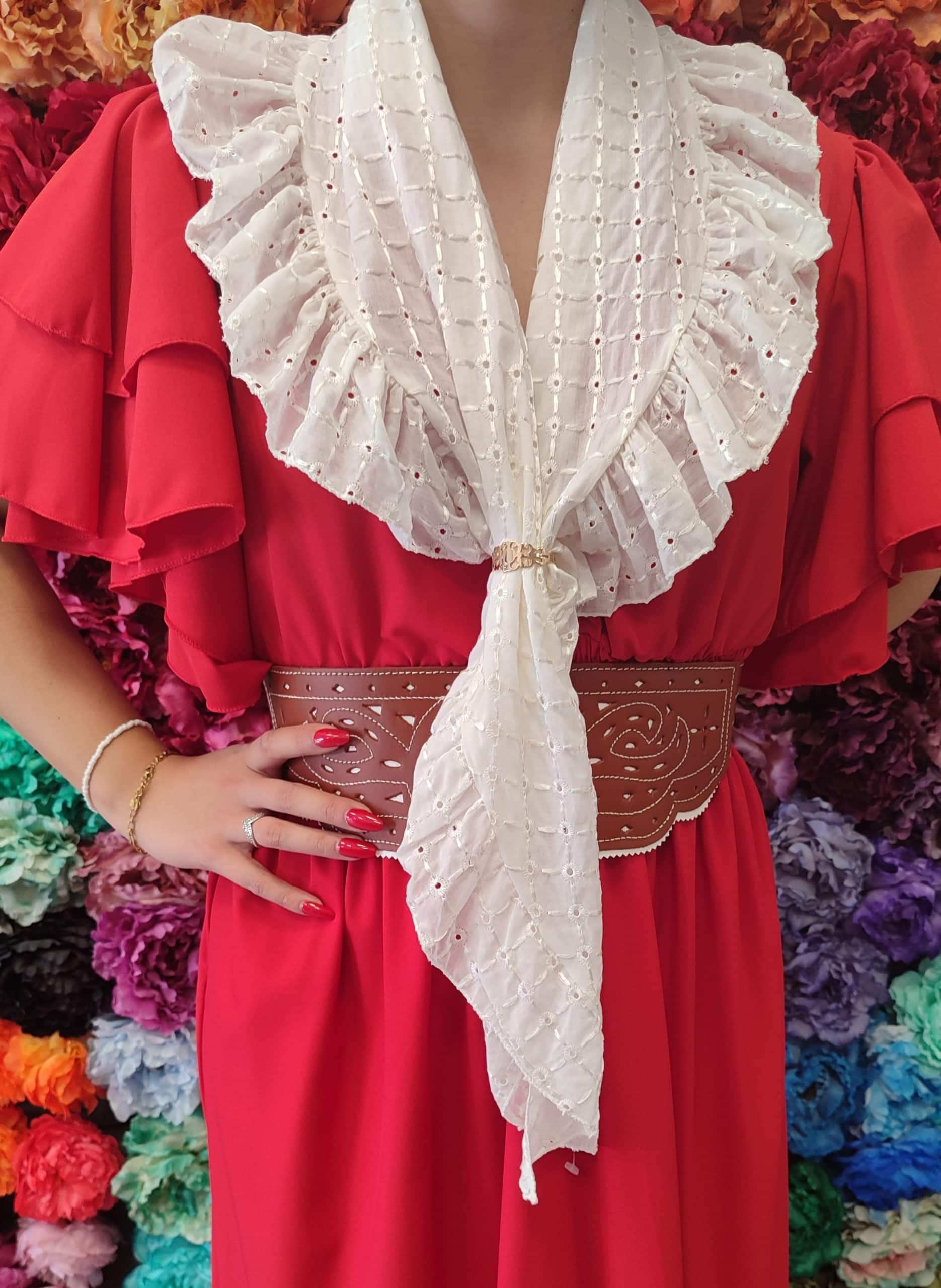Ramillete de flamenca en tonos azul azafata, cardenal y coral