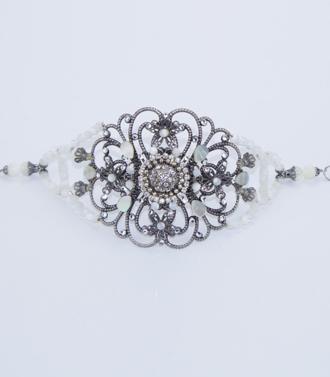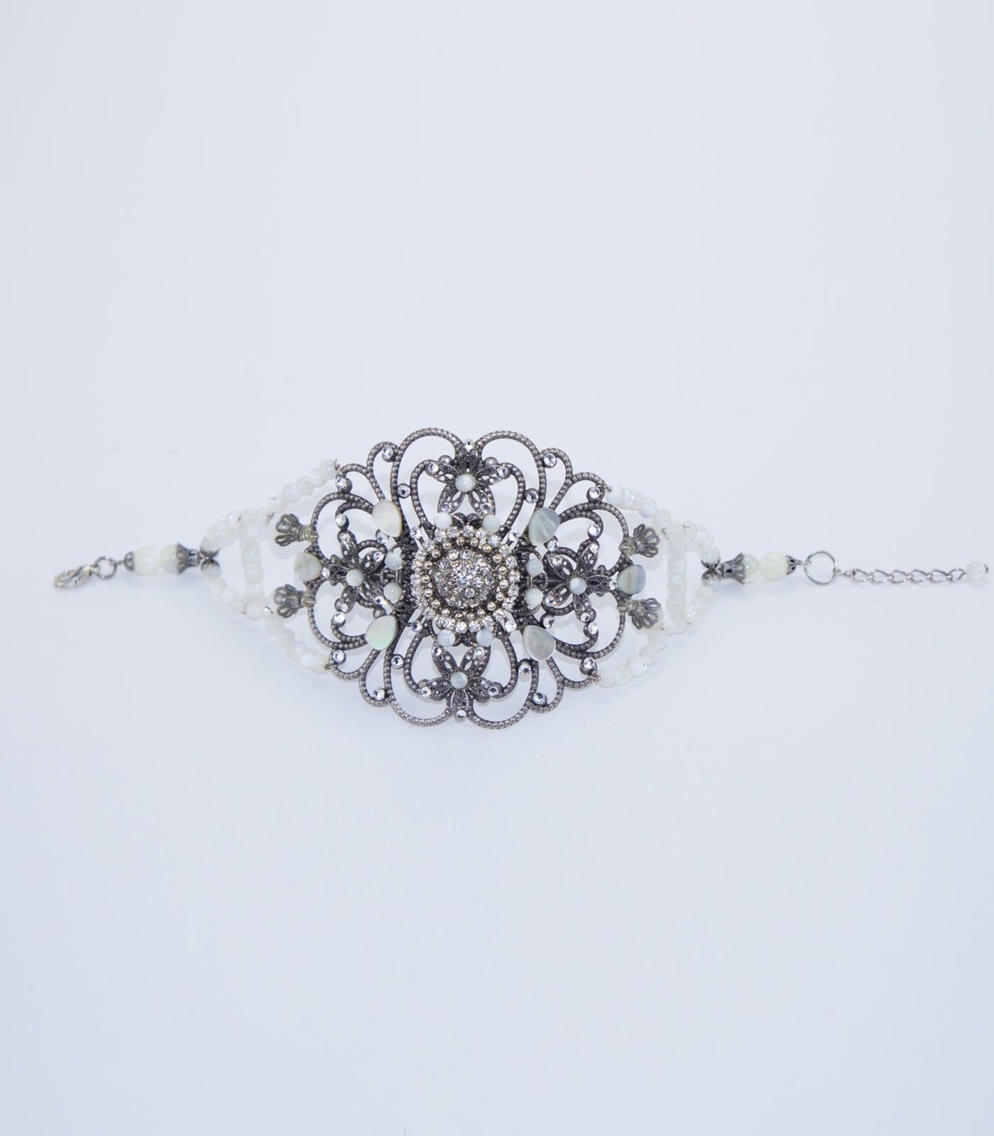 Pulsera-brazalete con fornitura metálica, perlas blancas y símil de cristal. Cierre tipo mosquetón.