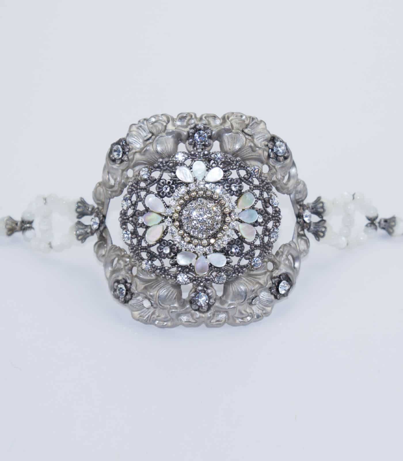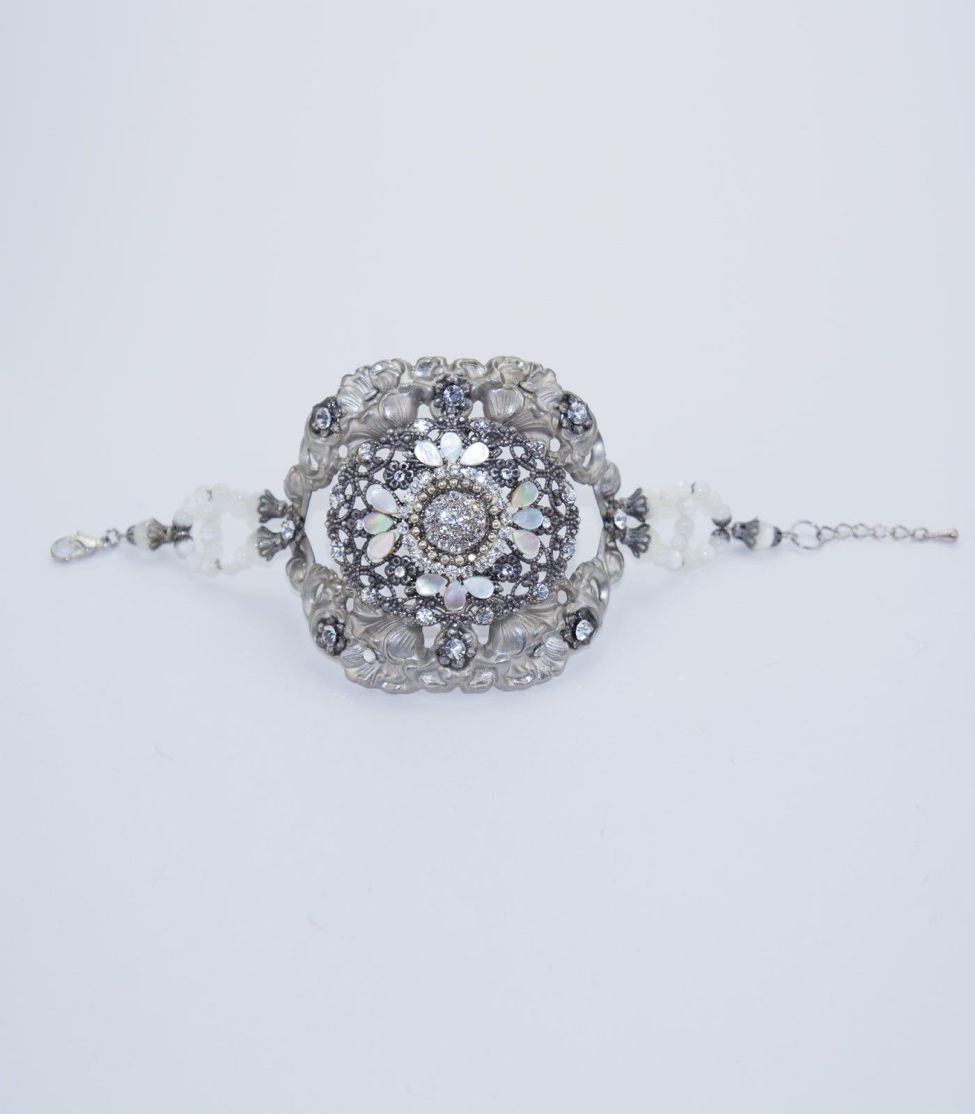 Pulsera-brazalete con fornitura metálica, lágrimas de nácar y símil de cristal. Cierre tipo mosquetón.