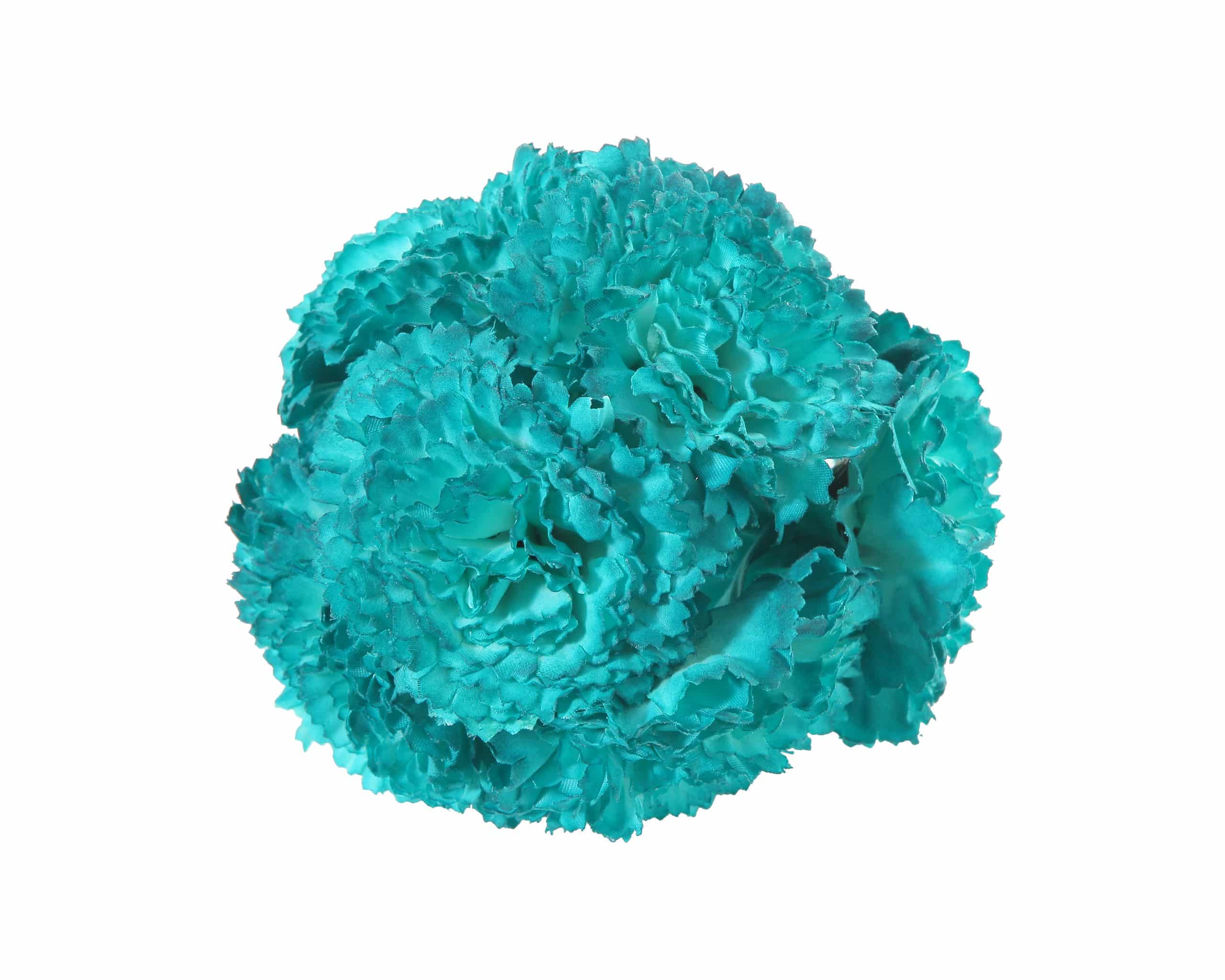 Ramillete de claveles de flamenca de tamaño grande, con un diámetro aproximado de 20 cms y color Aguamarina. Ideal para colocar en forma de ramillete y también en forma de tiara. Elaborada artesanalmente en Sevilla.