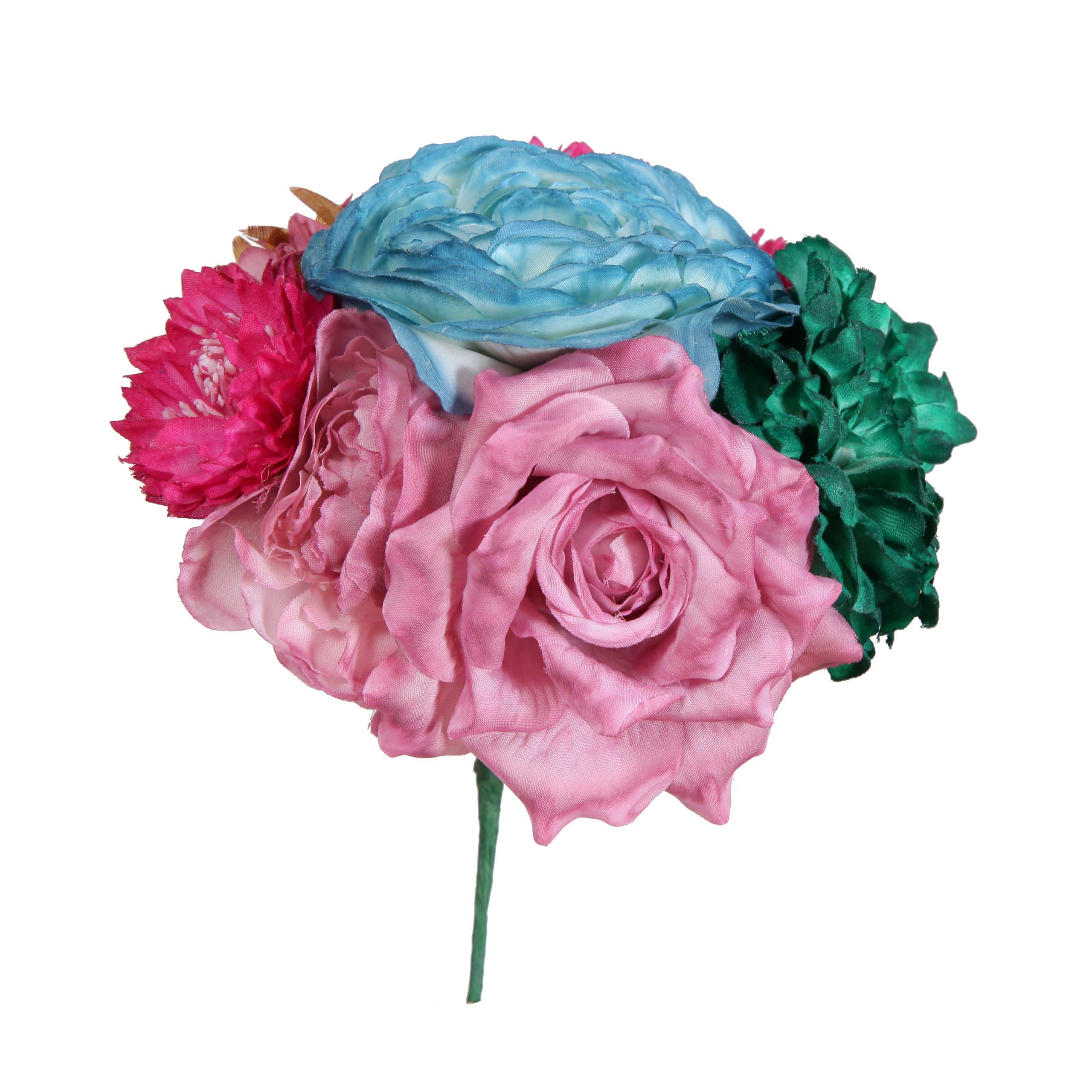 Ramillete tiara de flamenca multicolor en tonos buganvilla, malva antiguo, azul azafata y verde botella.