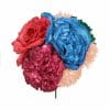 Ramillete tiara de flamenca multicolor en tonos rojo carmín, verde botella, azul azafata y beige.