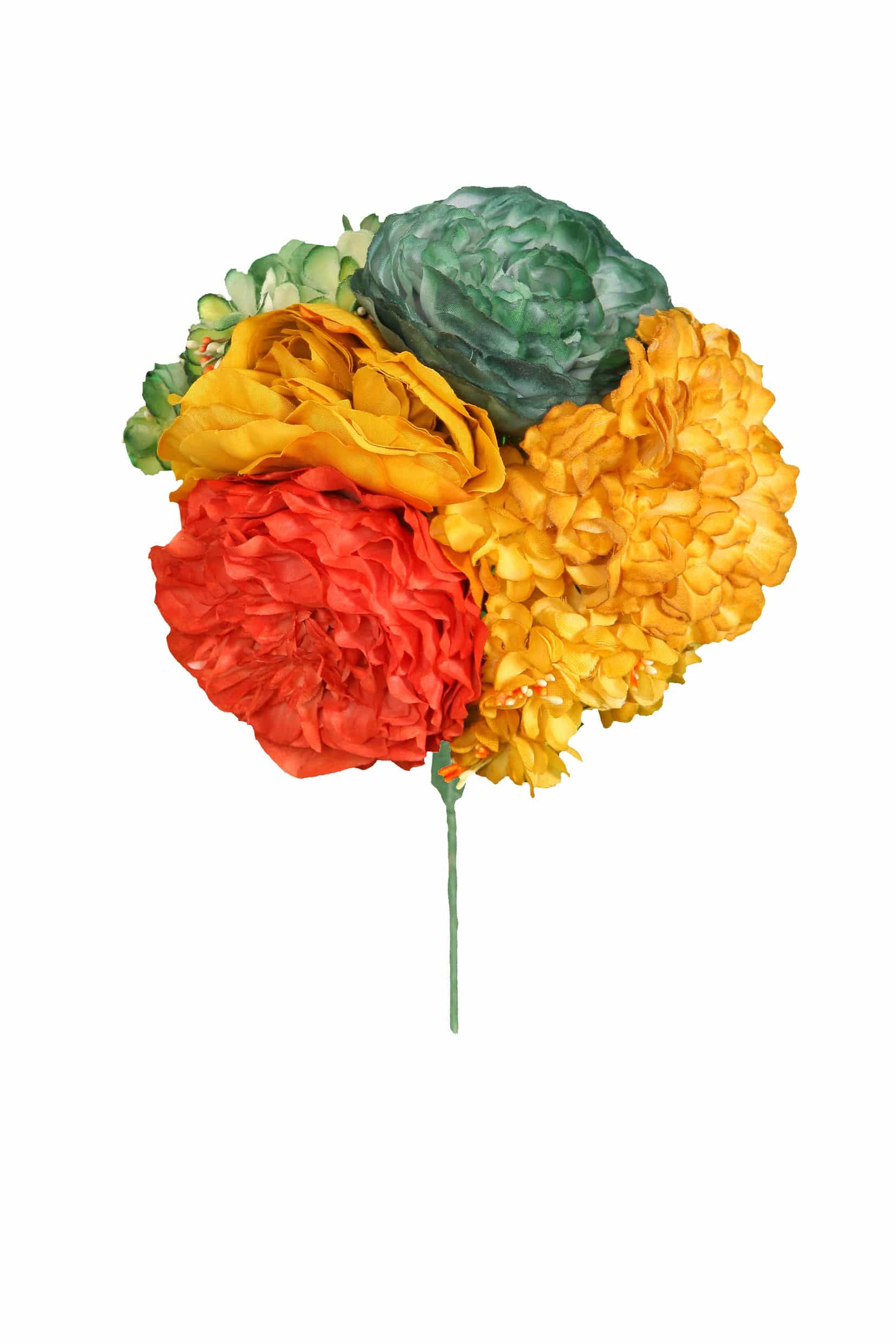 Ramillete tiara de flamenca multicolor en tonos albero, naranja y verde.