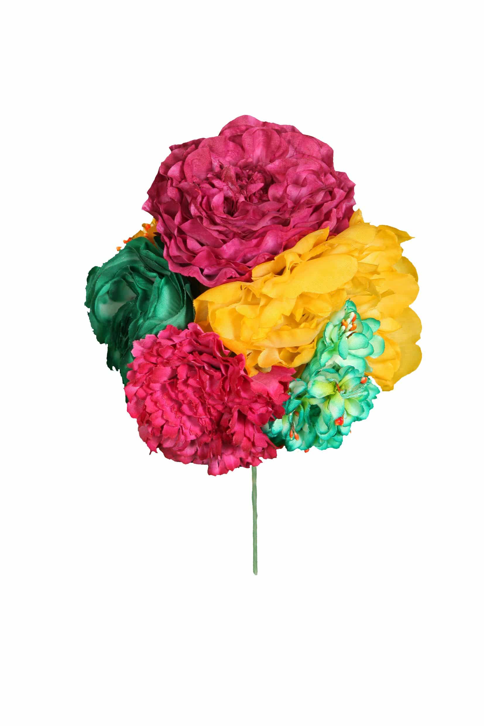 Ramillete tiara de flamenca multicolor en tonos buganvillas, verdes y amarillos.