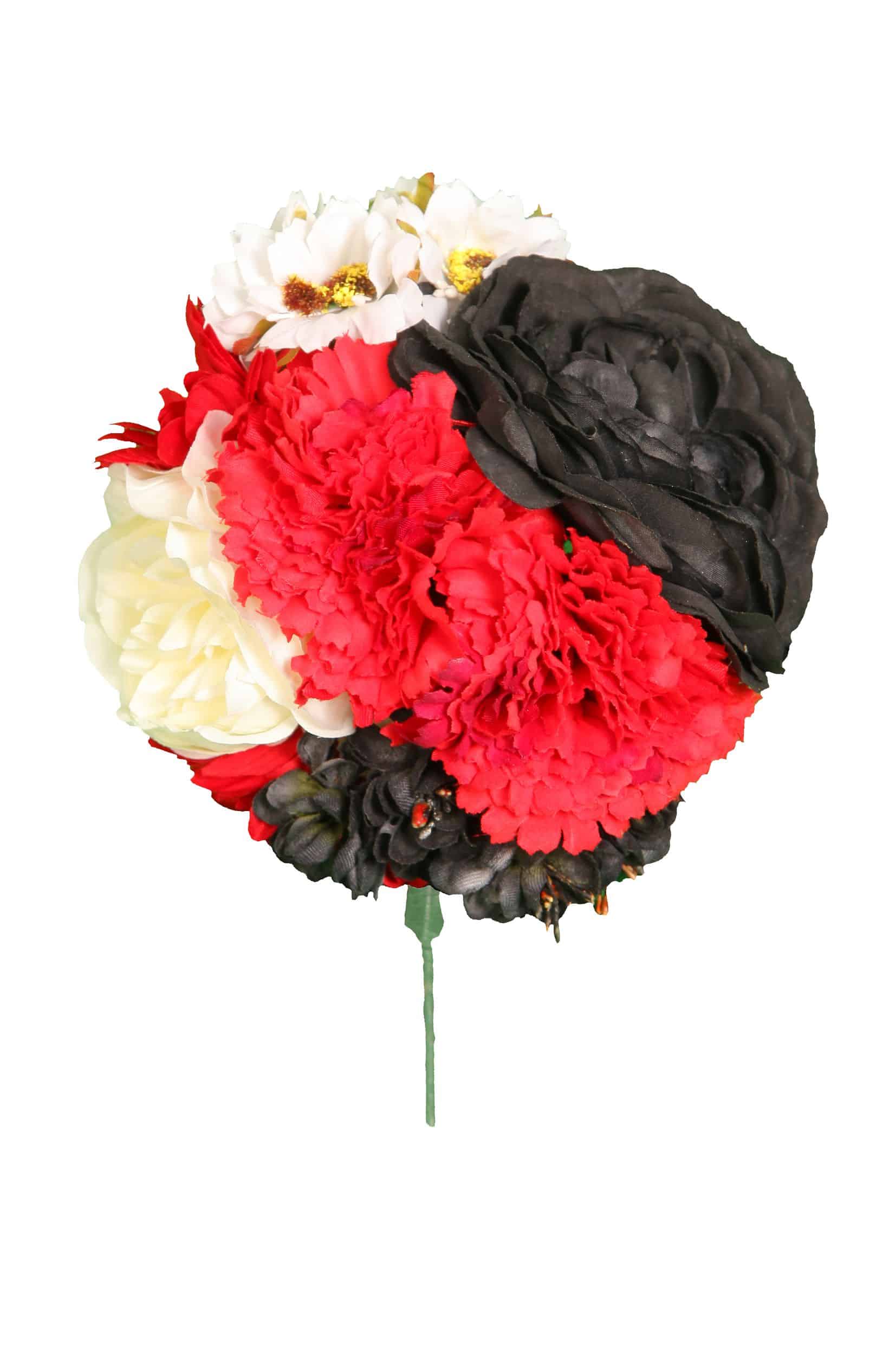 Ramillete tiara de flamenca multicolor en tonos negros, blancos y rojos.