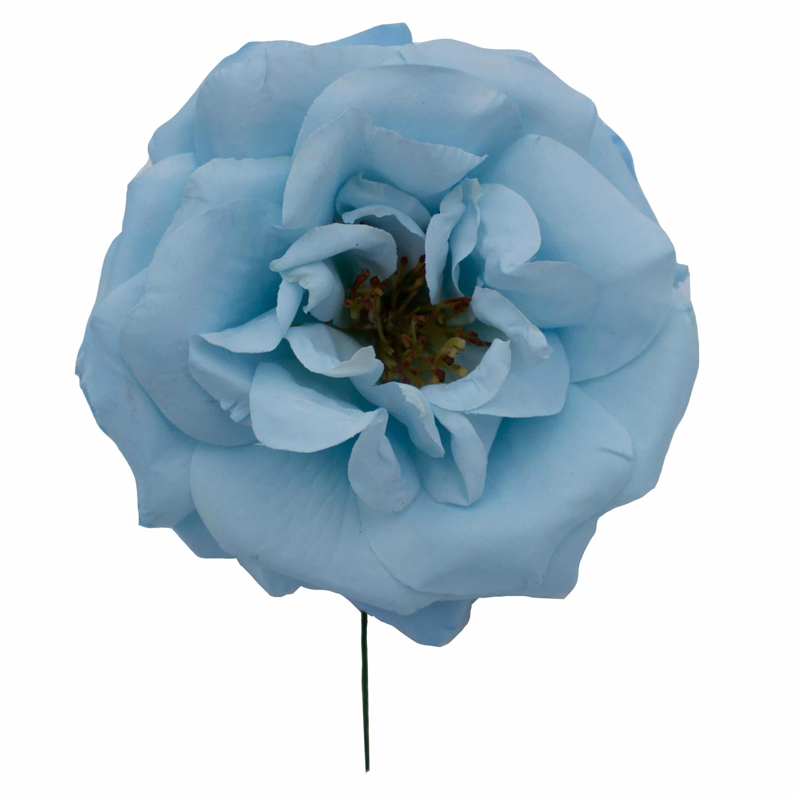 Flor de flamenca estilo rosa, de tamaño grande, con un diámetro aproximado de 14,5 cms y color Azul Celeste. Elaborada artesanalmente en Sevilla.
