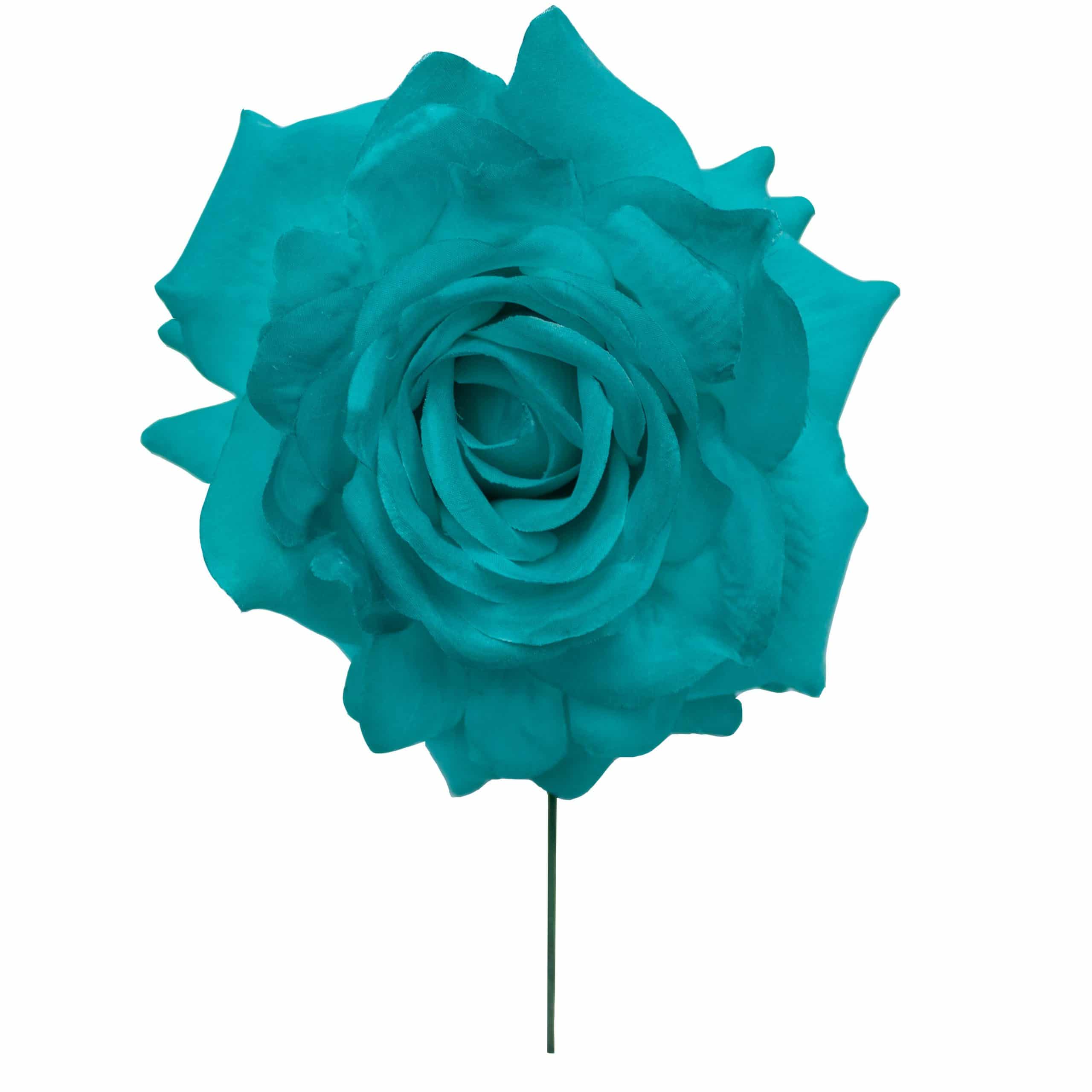 Flor de flamenca estilo rosa, de tamaño grande, con un diámetro aproximado de 13 cms y color Aguamarina. Elaborada artesanalmente en Sevilla.