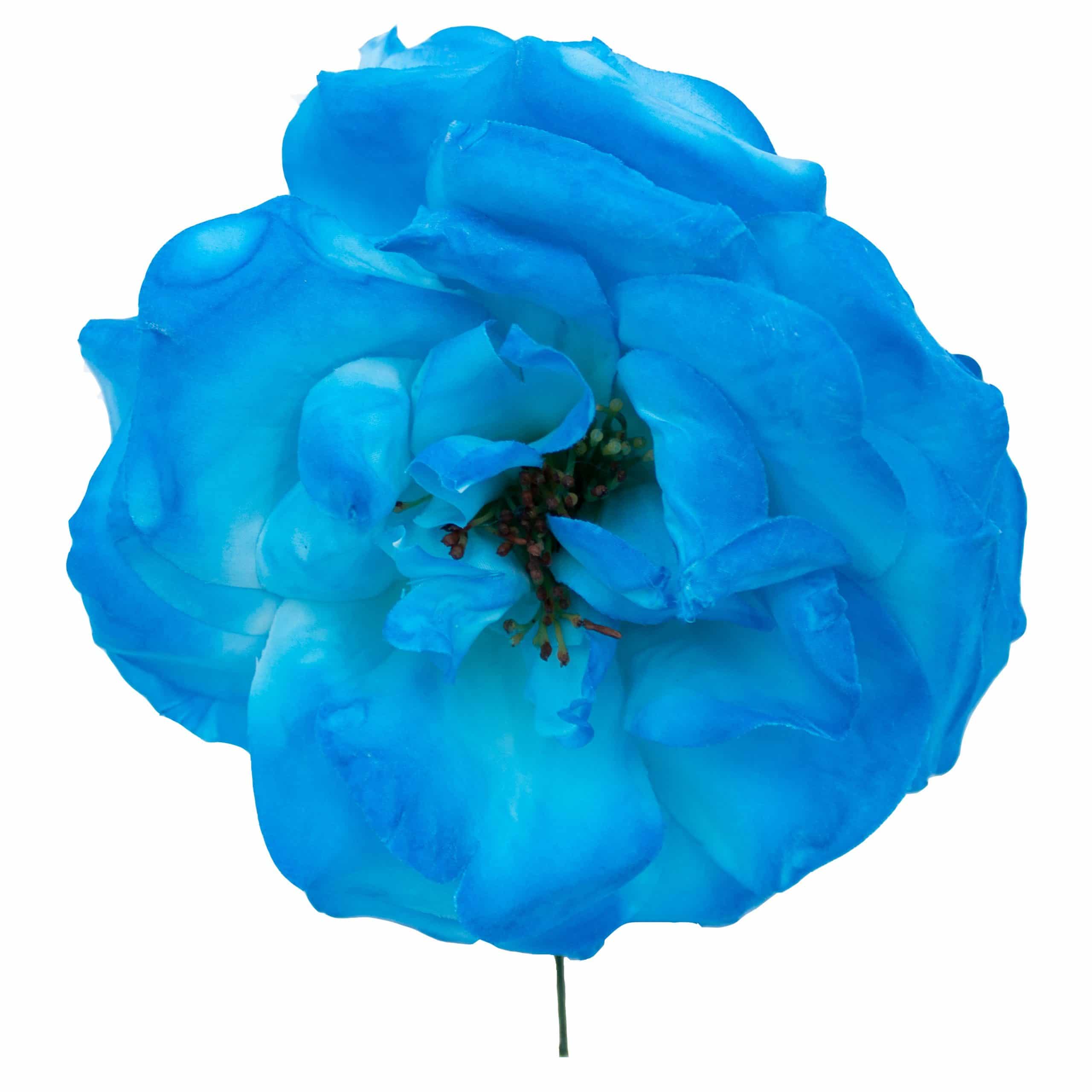 Flor de flamenca estilo rosa, de tamaño grande, con un diámetro aproximado de 14,5 cms y color Azul Turquesa. Elaborada artesanalmente en Sevilla.