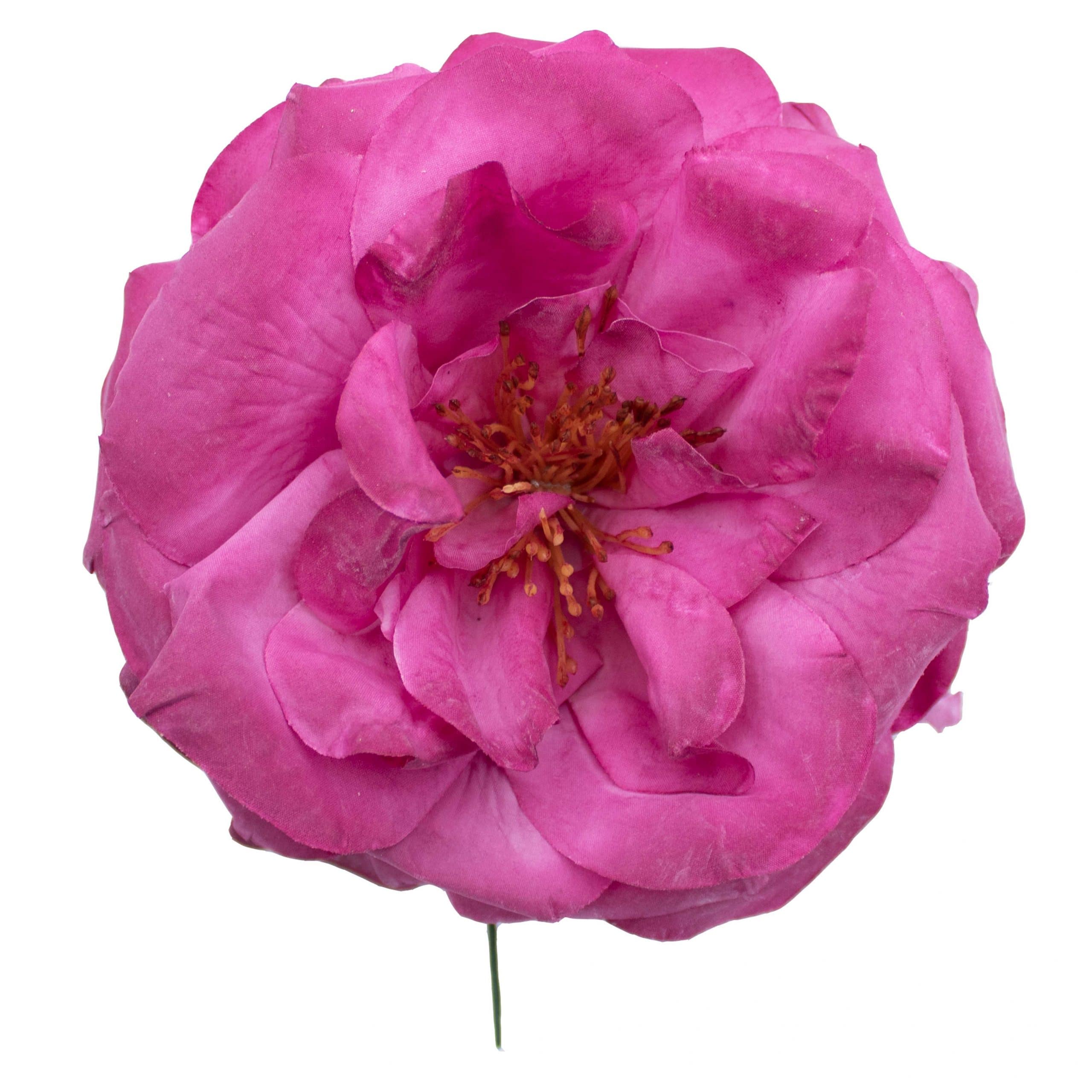 Flor de flamenca estilo rosa, de tamaño grande, con un diámetro aproximado de 14,5 cms y color Buganvilla. Elaborada artesanalmente en Sevilla.