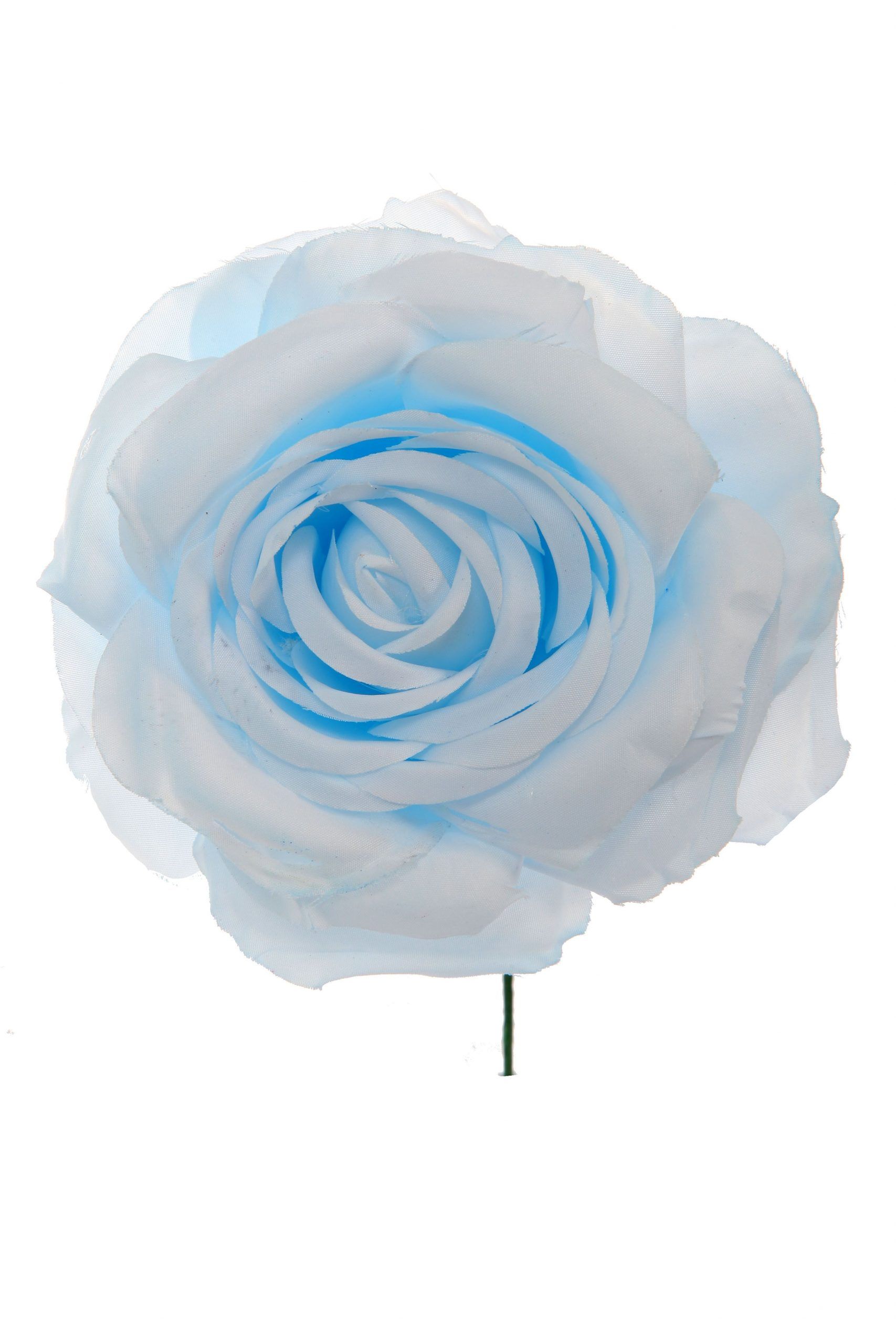 Flor de flamenca estilo rosa, en color celeste, de tamaño mediano, con un diámetro aproximado de 12 cms. Elaborada artesanalmente en Sevilla.