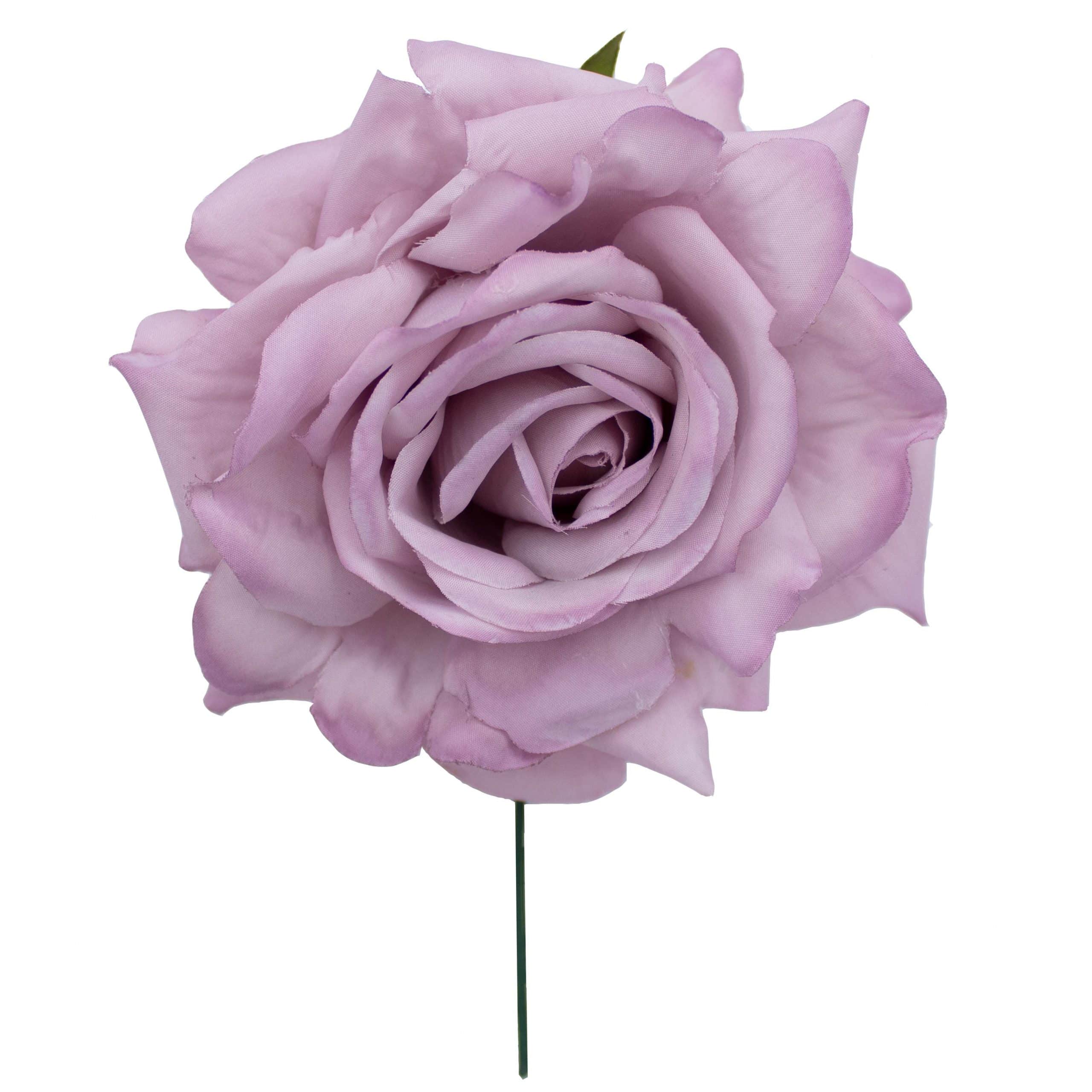 Flor de flamenca estilo rosa, de tamaño grande, con un diámetro aproximado de 13 cms y color Malva Antiguo. Elaborada artesanalmente en Sevilla.