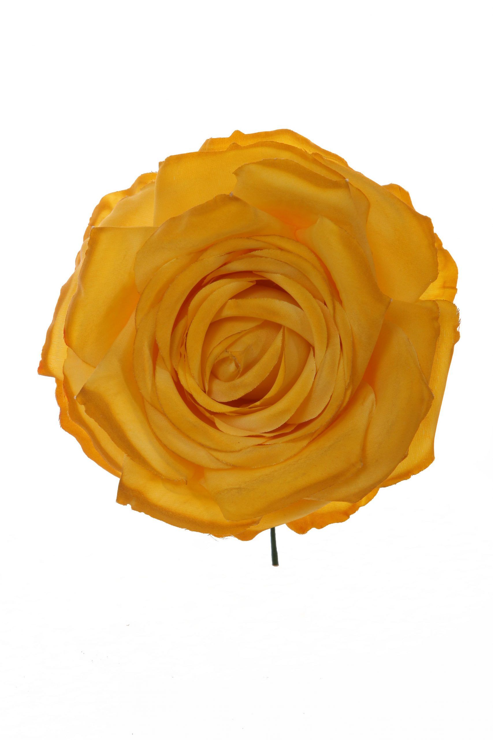 Flor de flamenca estilo rosa, en color mostaza degradé, de tamaño mediano, con un diámetro aproximado de 12 cms. Elaborada artesanalmente en Sevilla.