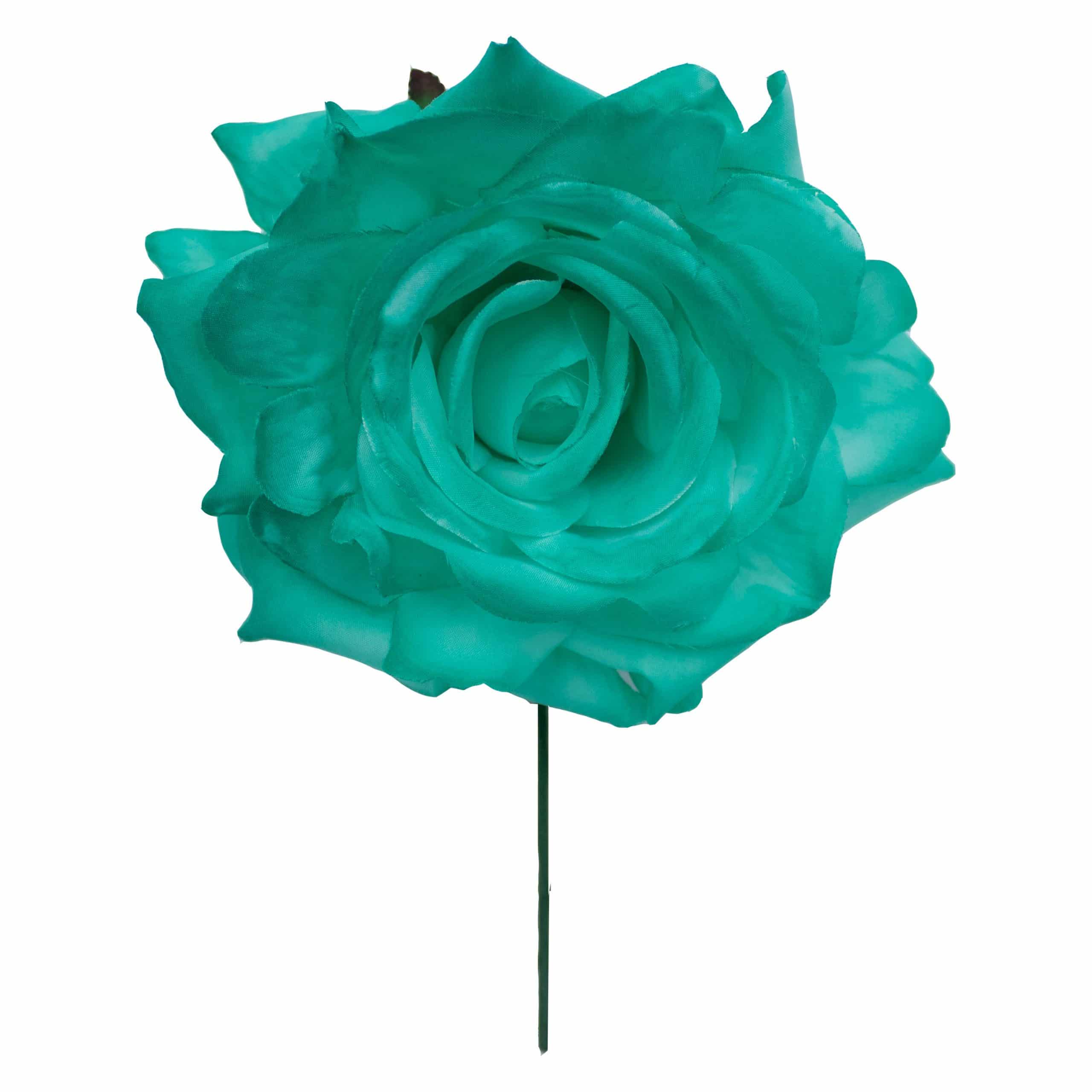 Flor de flamenca estilo rosa, de tamaño grande, con un diámetro aproximado de 13 cms y color Verde Agua. Elaborada artesanalmente en Sevilla.