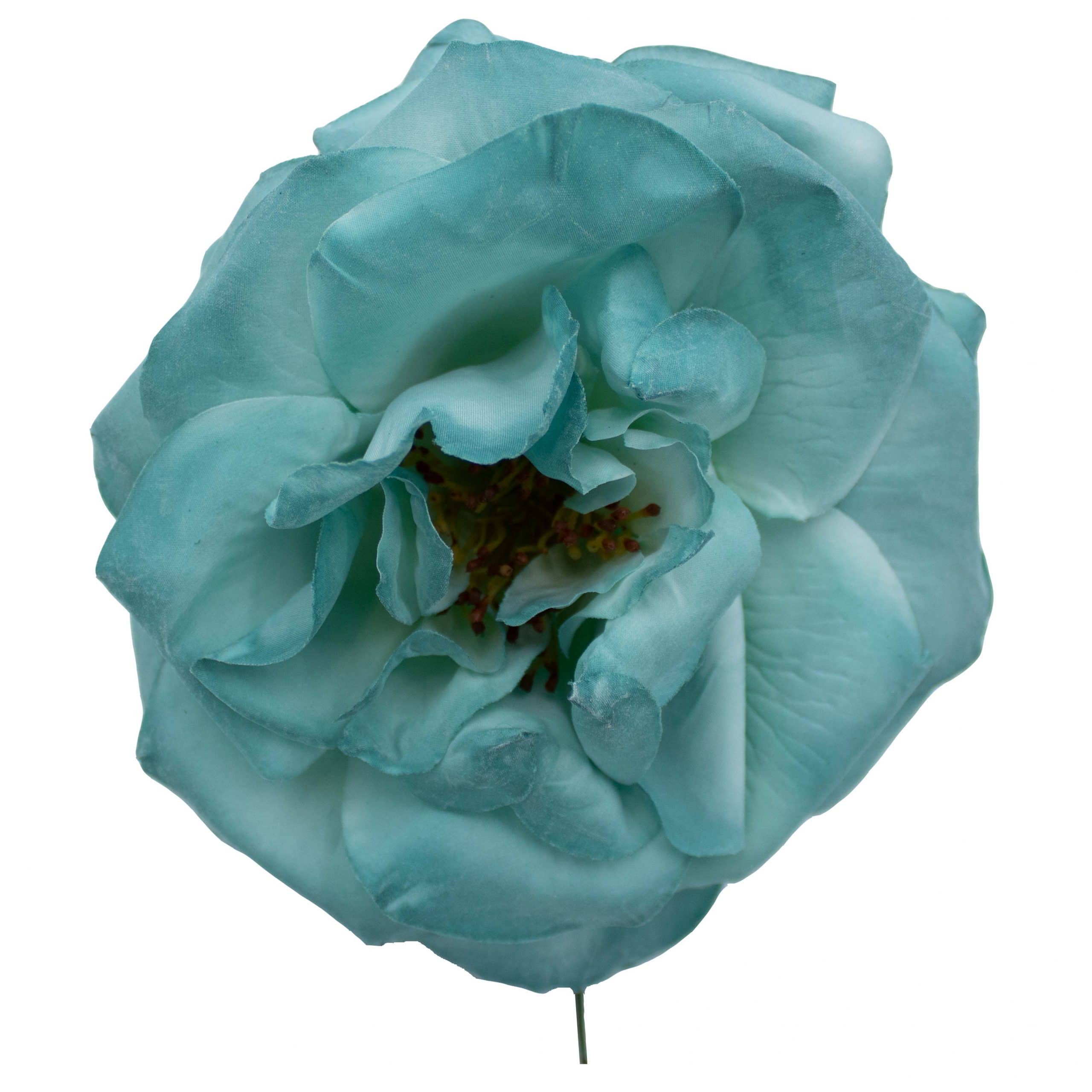 Flor de flamenca estilo rosa, de tamaño grande, con un diámetro aproximado de 14,5 cms y color Verde Agua Envejecido. Elaborada artesanalmente en Sevilla.