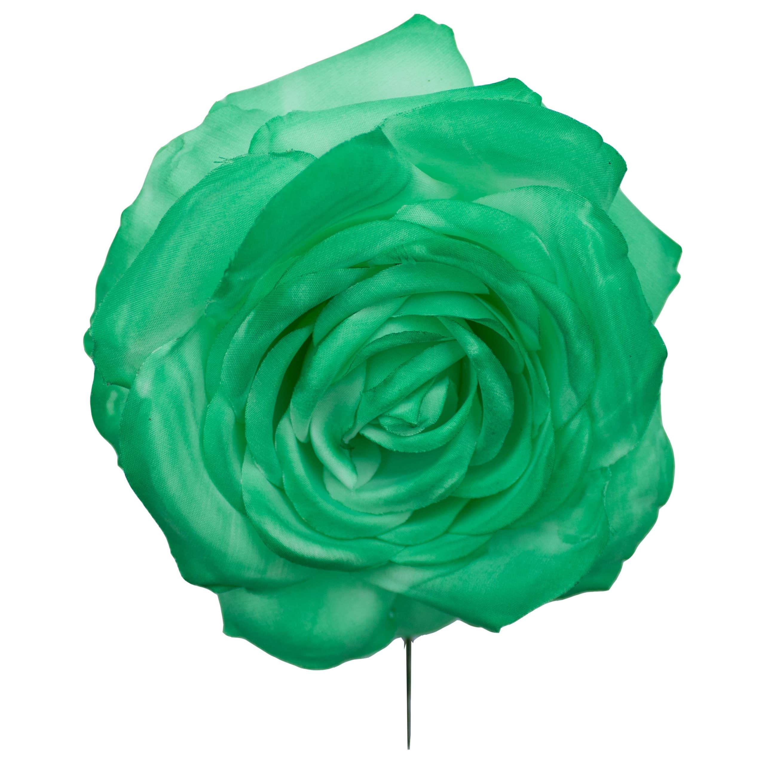 Flor de flamenca estilo rosa, de tamaño mediano, con un diámetro aproximado de 11 cms y color Verde Andalucía. Elaborada artesanalmente en Sevilla.