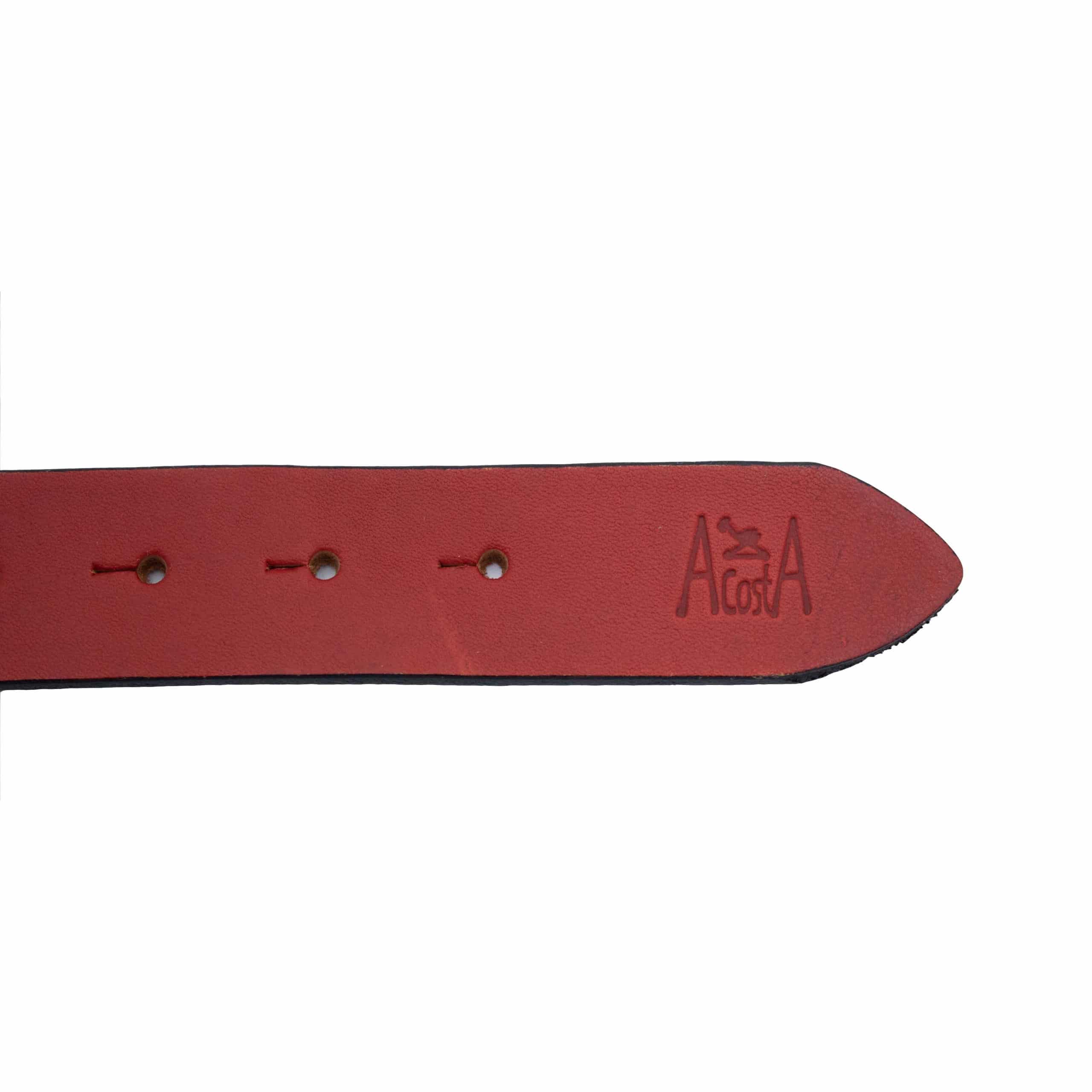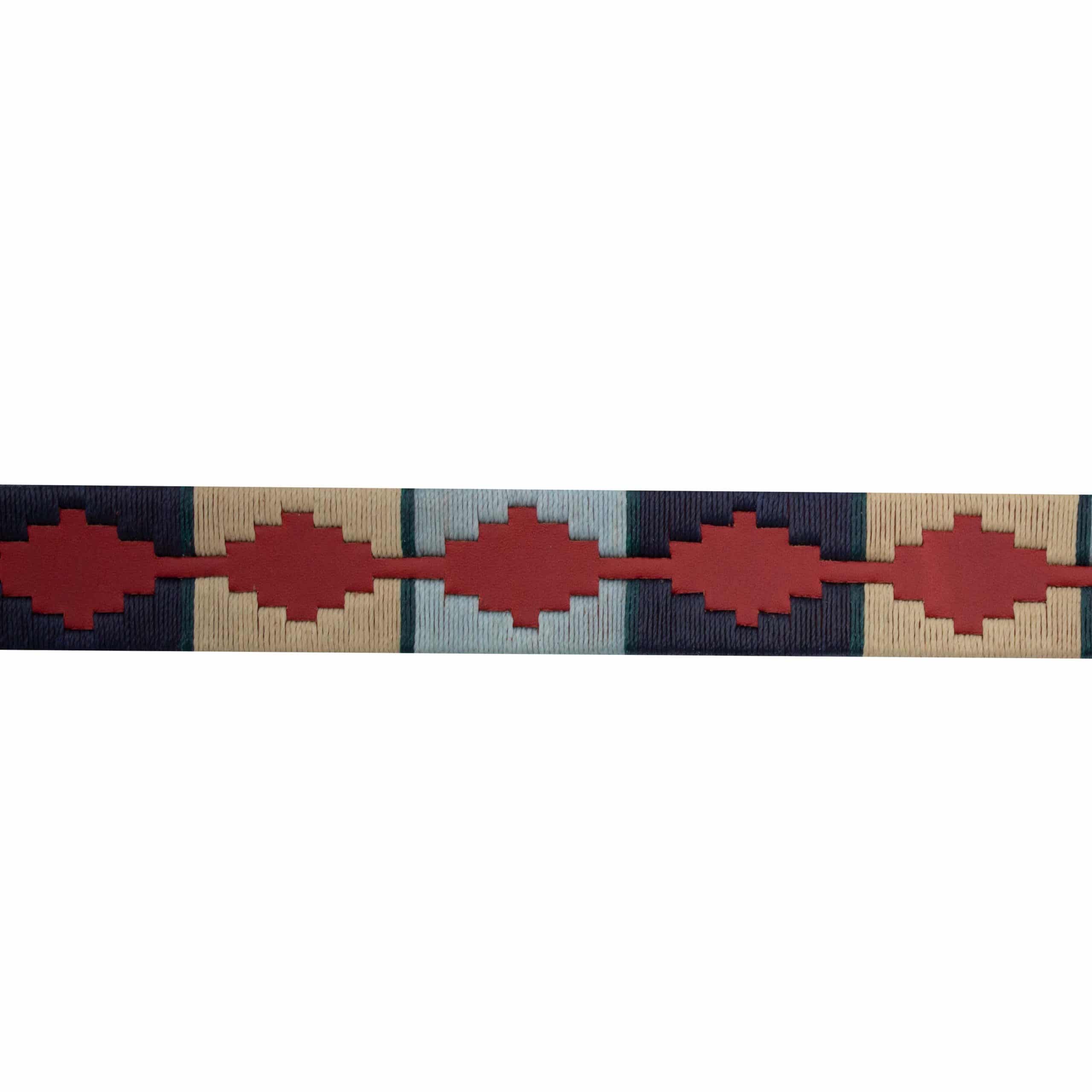 Cinturón rojo para hombre y mujer de auténtico cuero argentino bordado con hilo encerado. Bordado en tonos azules y beige.
