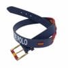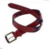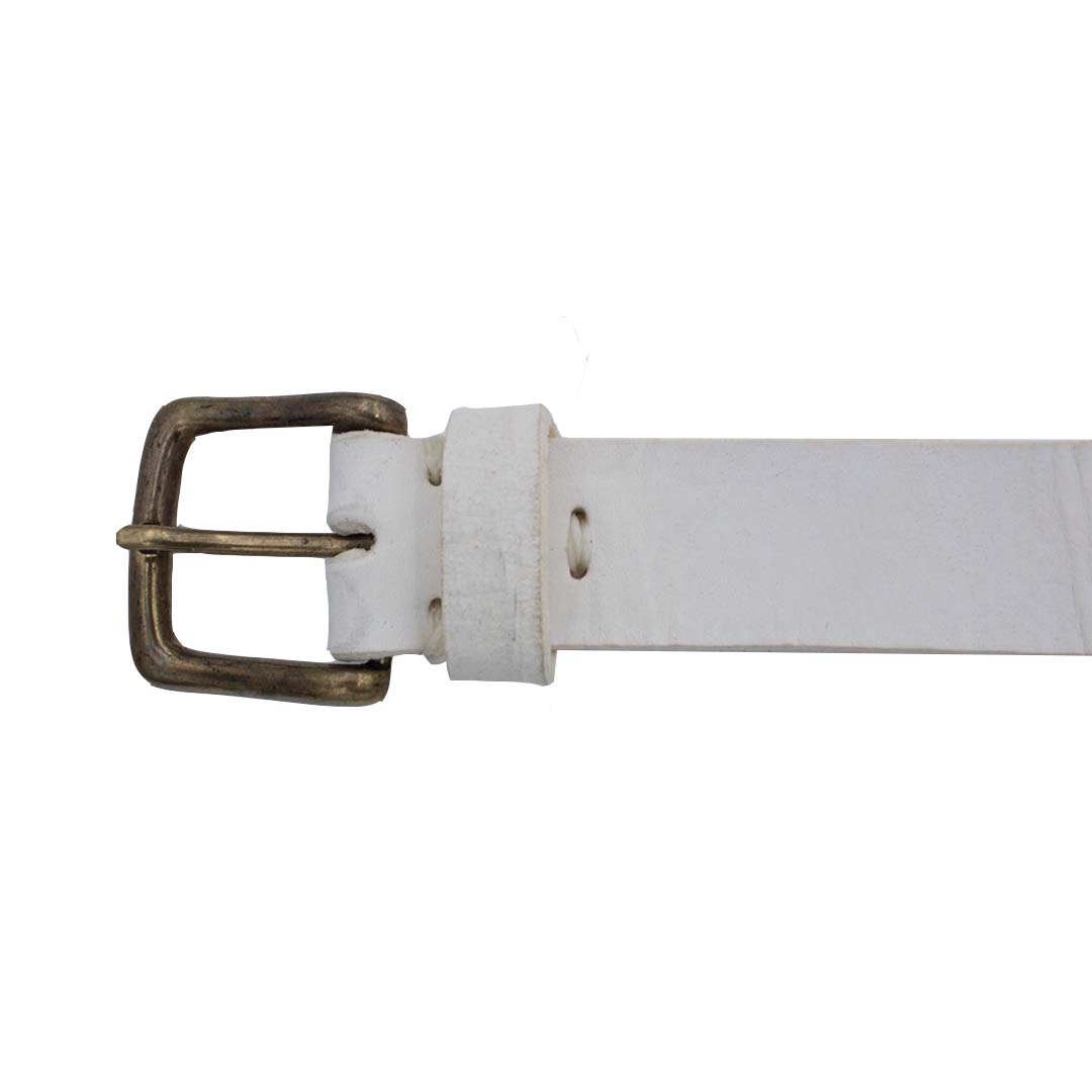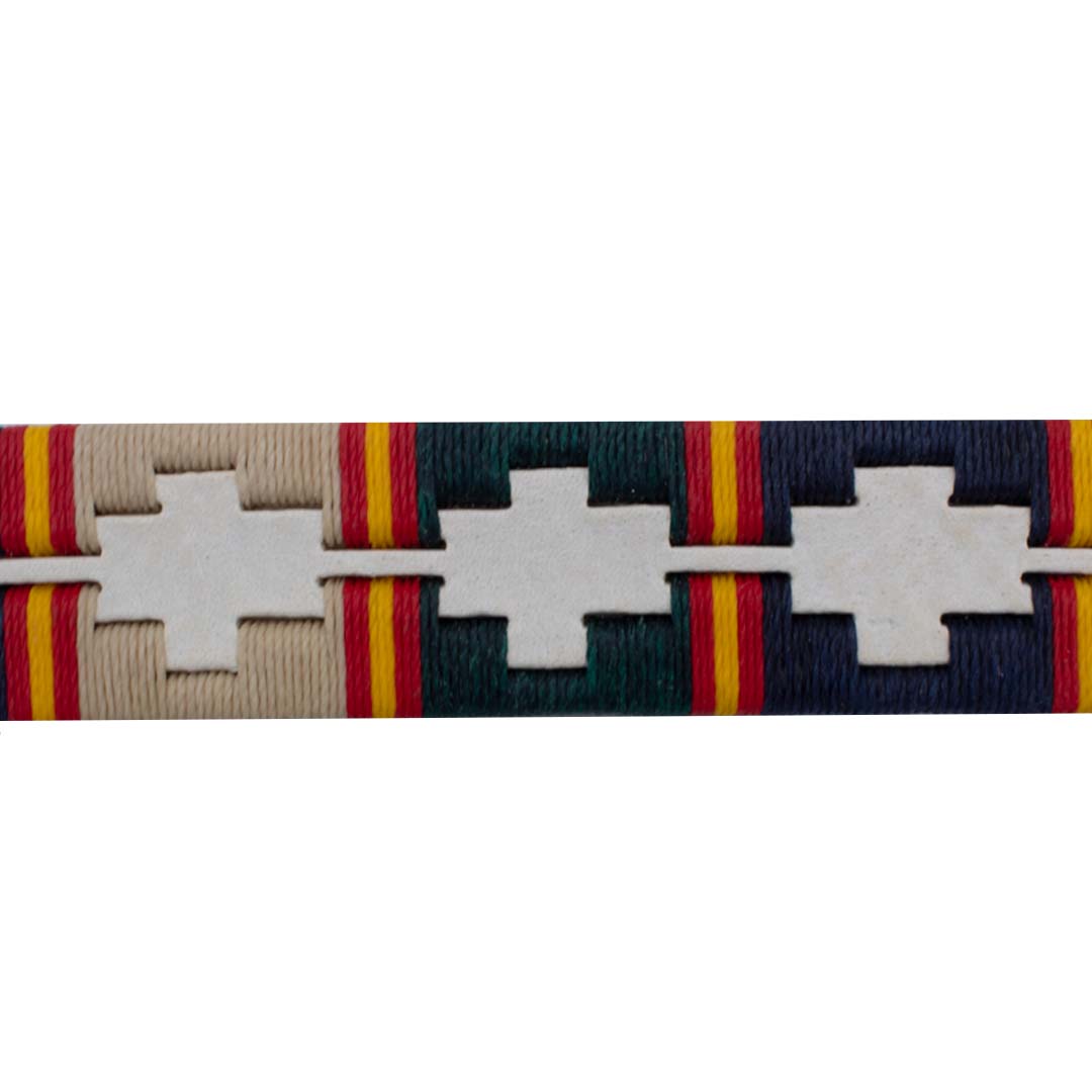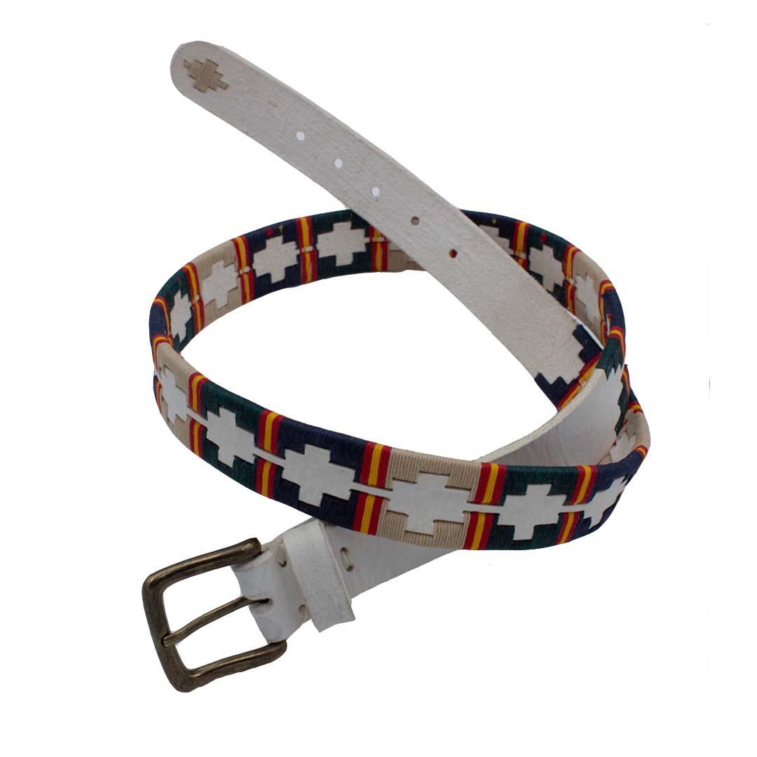 Cinturón blanco para hombre y mujer de auténtico cuero argentino bordado con hilo encerado. Bordado en tonos verdes, azul marino y beige con marcas de la bandera de España.