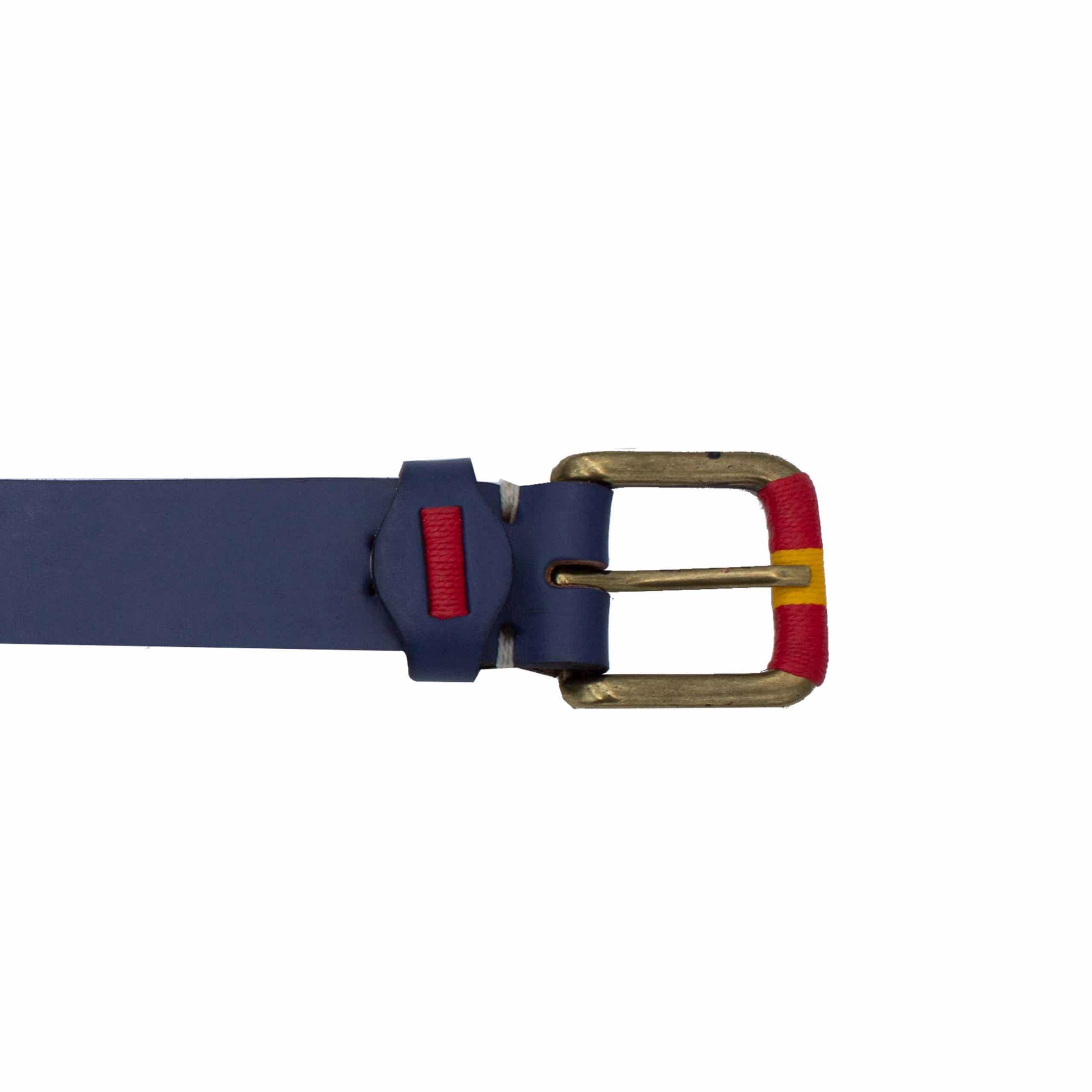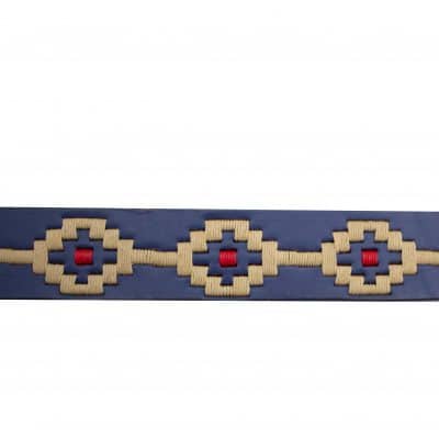 Talla 95- Cinturón unisex azul de cuero con bordados amarillos y azules. Temática Selección Nacional de Polo