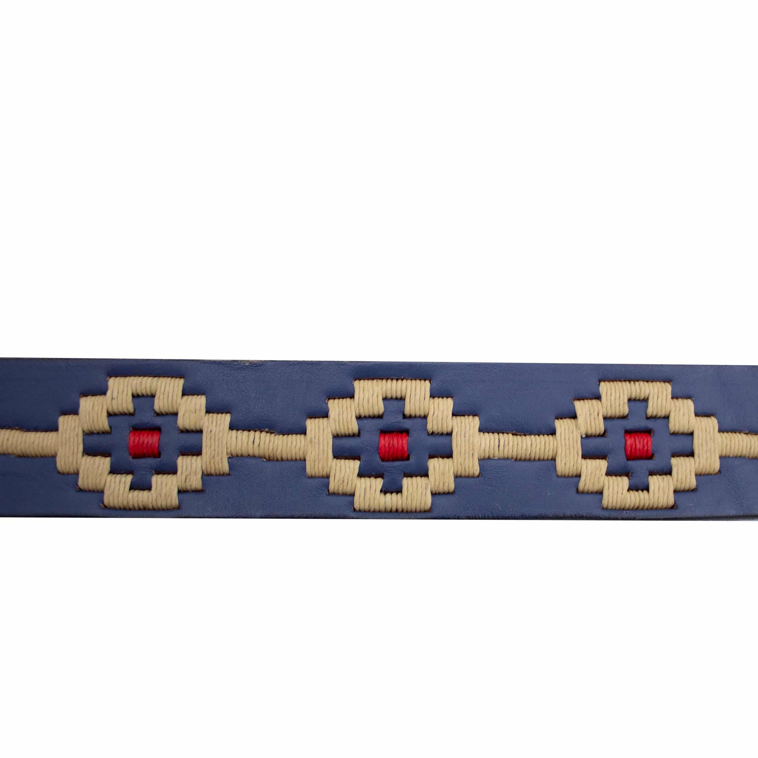 Cinturón azul de hombre y mujer de auténtico cuero argentino bordado con hilo encerado. Bordado en tonos beige.