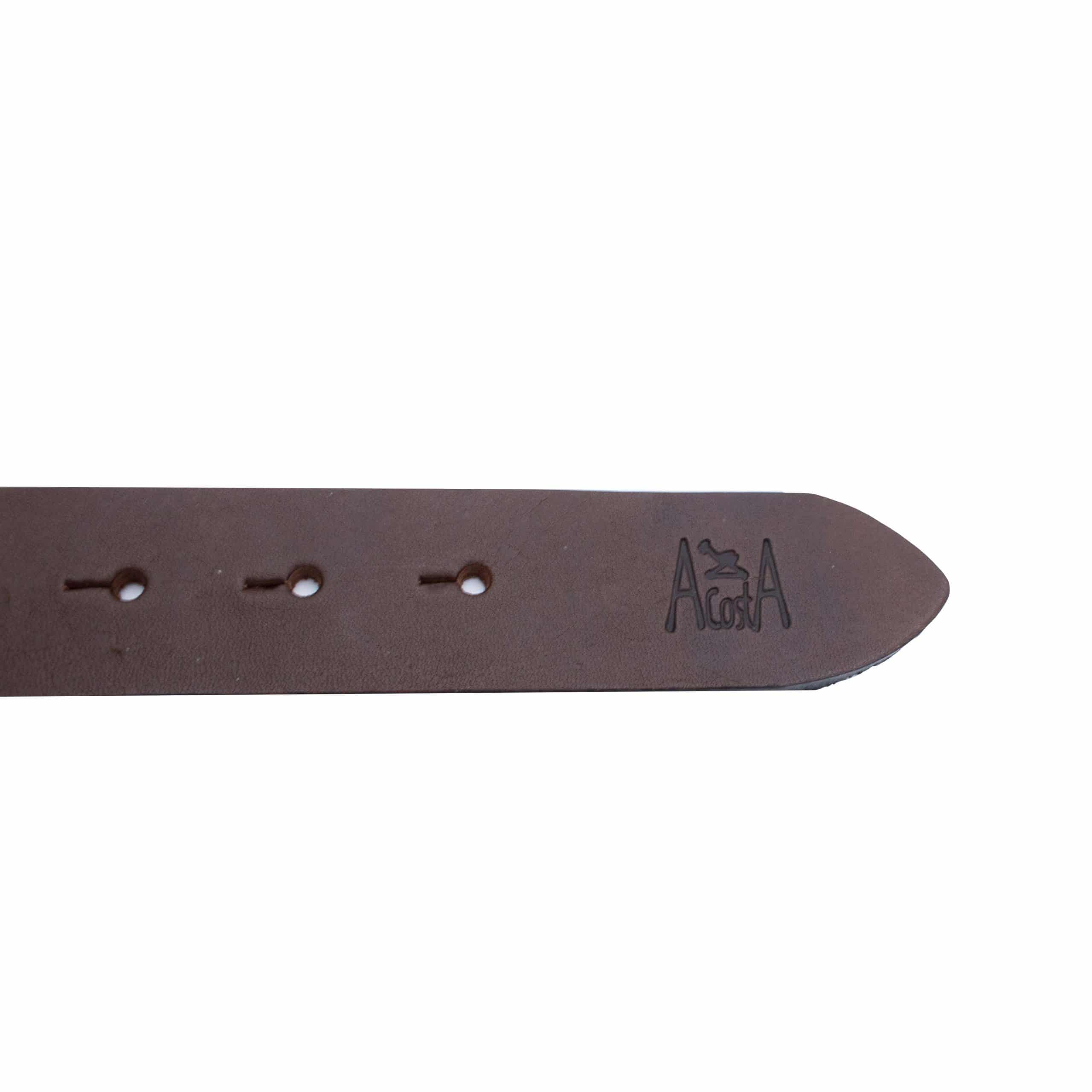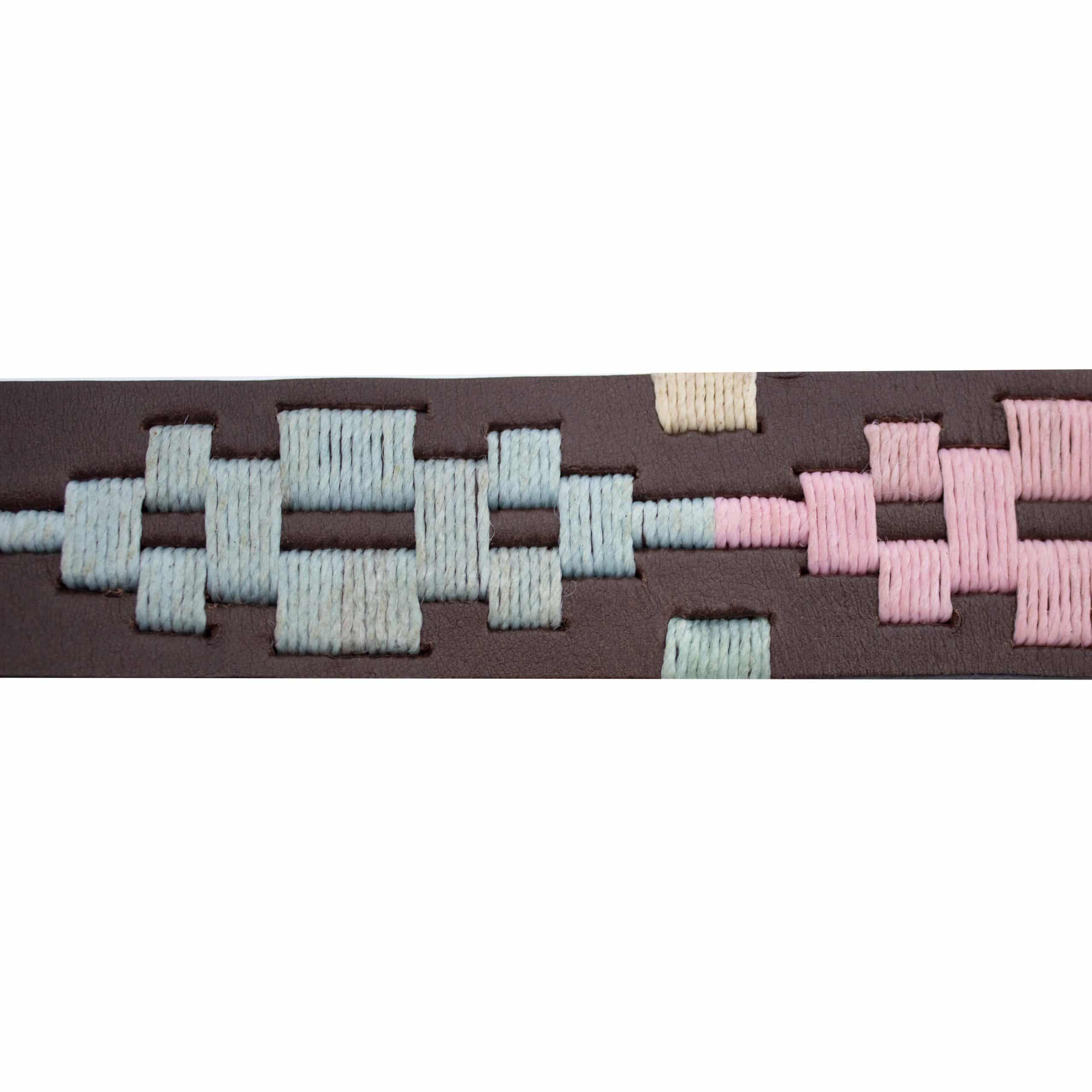 Cinturón marrón para hombre y mujer de auténtico cuero argentino bordado con hilo encerado. Bordado en tonosazul celeste y rosa.