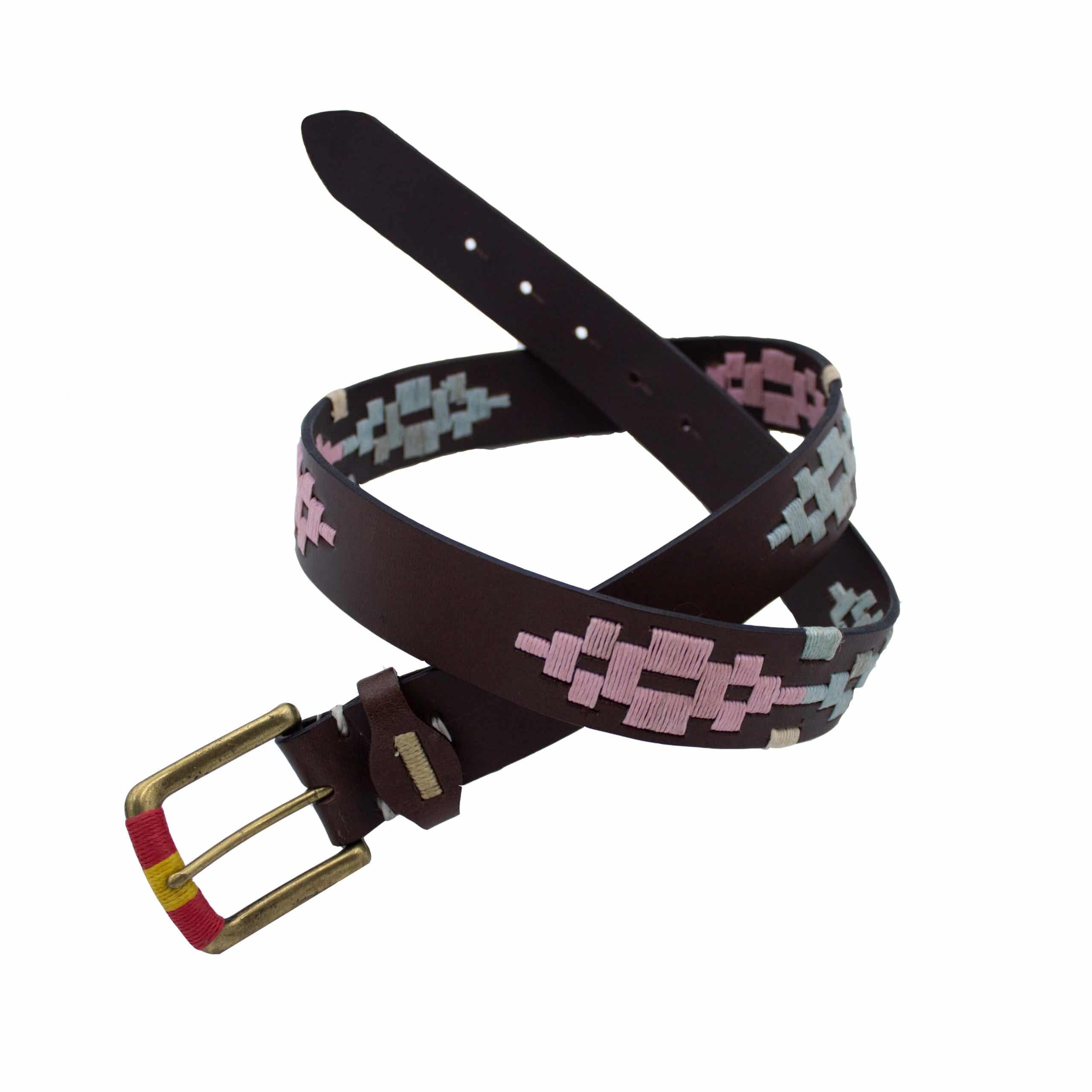 Talla 90- Cinturón unisex marrón de cuero con bordado azul y rosa