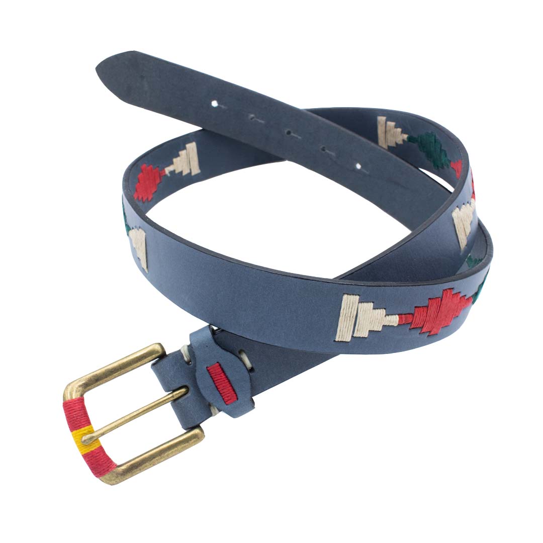 Cinturón azul para hombre y mujer de auténtico cuero argentino bordado con hilo encerado. Bordado en tonos verdes, beige y azul marino.