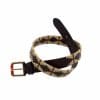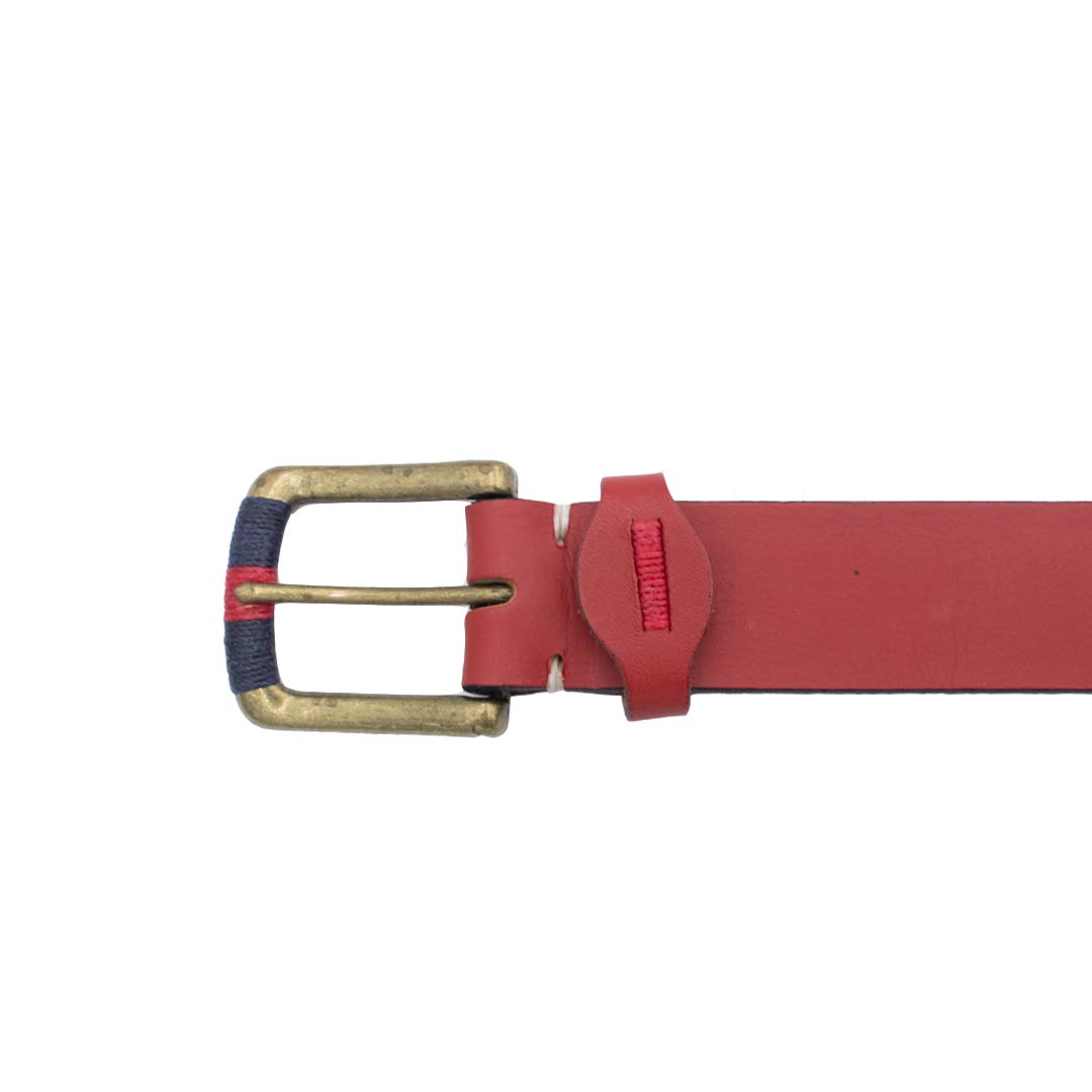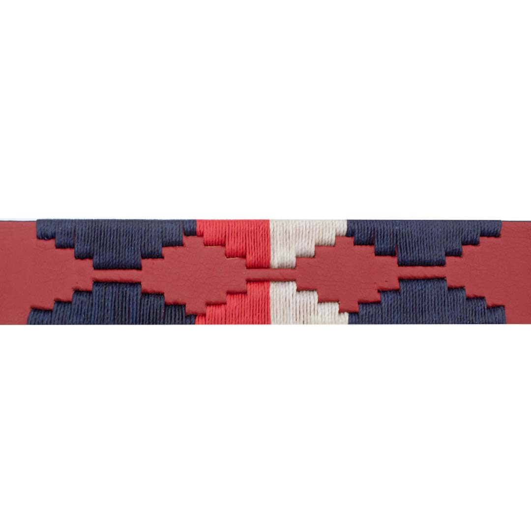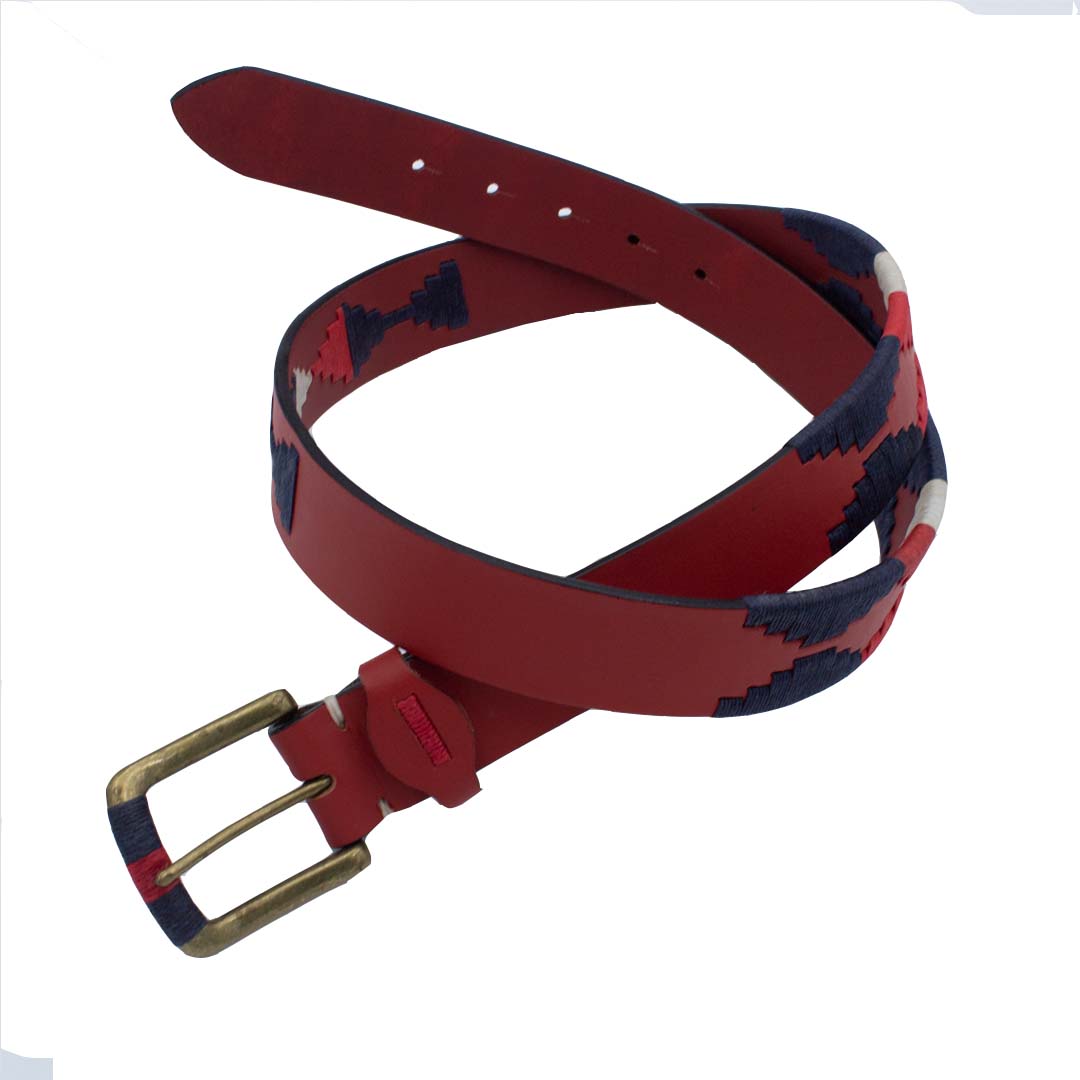 Cinturón rojo para hombre y mujer de auténtico cuero argentino bordado con hilo encerado. Bordado en tonos azul marino y beige.
