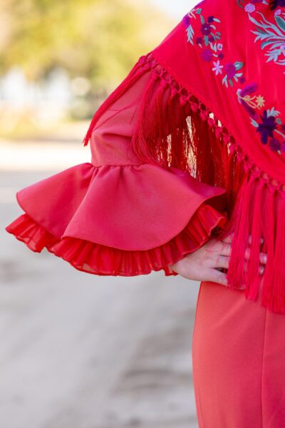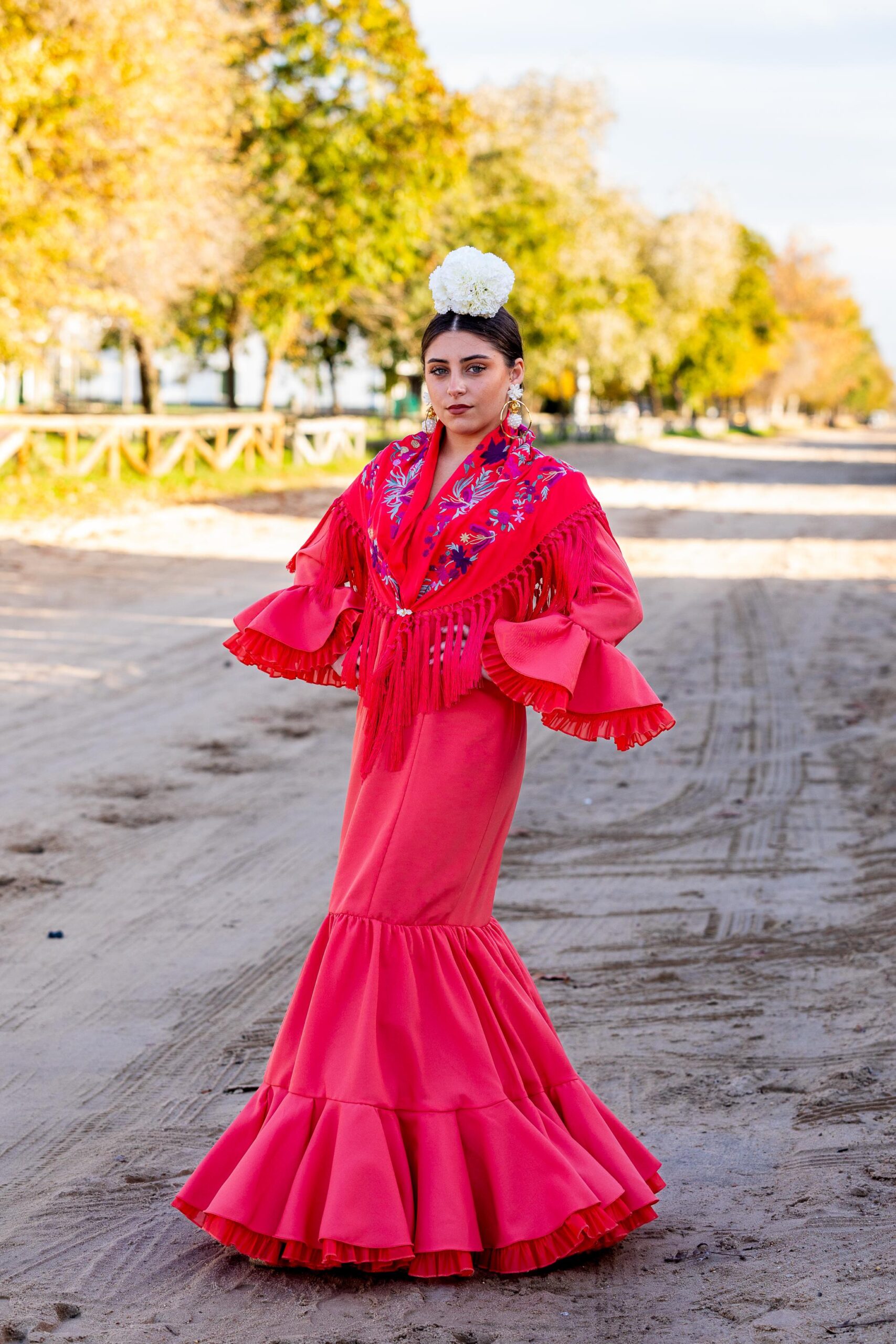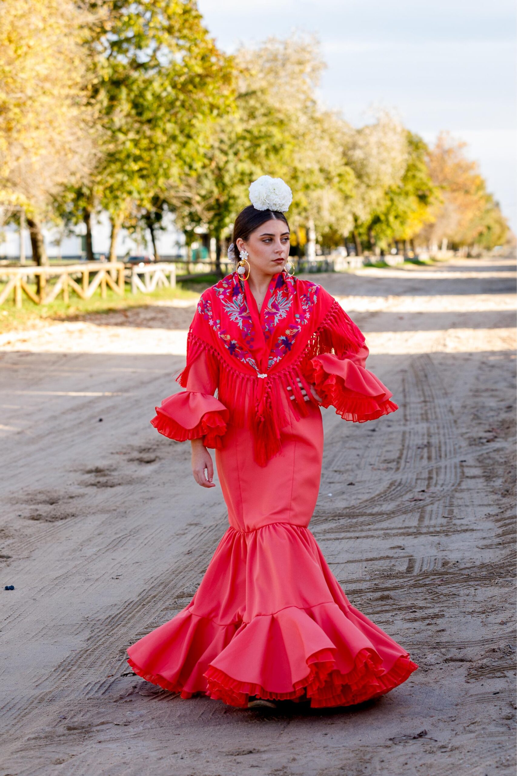 Traje de flamenca de un solo volante con relleno de nylon para conseguir una falda con mucho volumen. Media manga con maxi volantes.