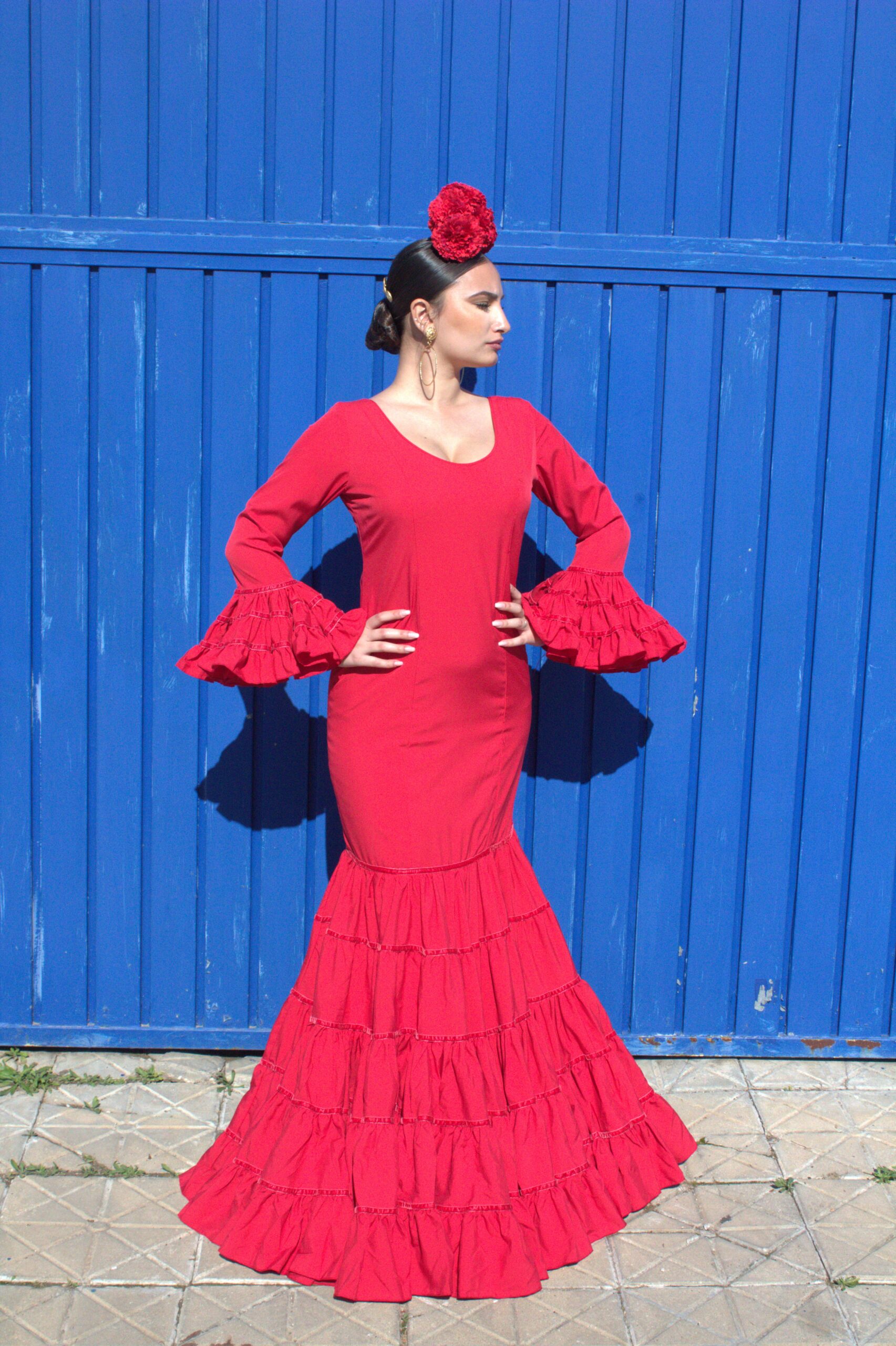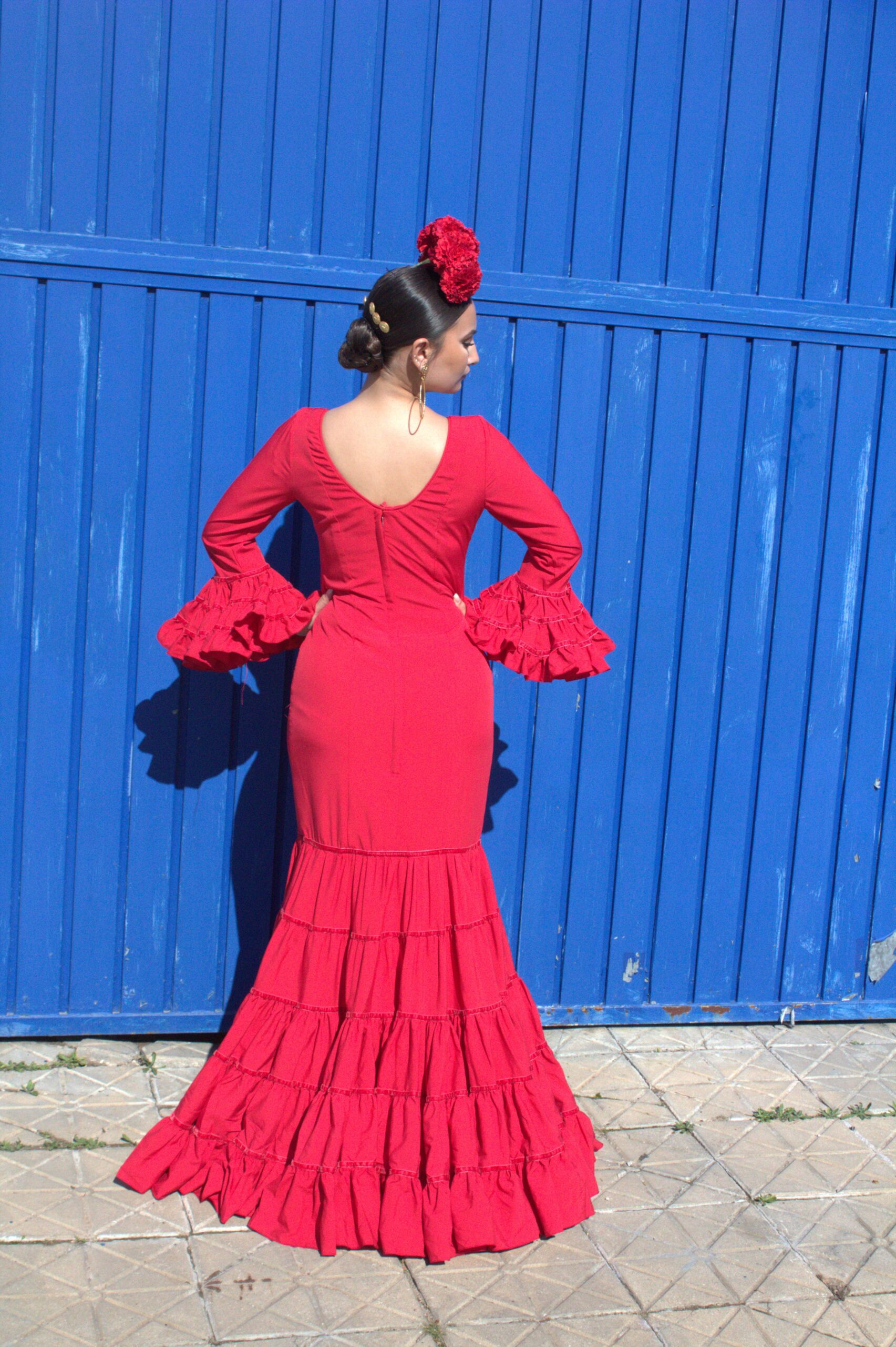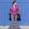 Traje de flamenca de canastero de lunares con cintas de terciopelo.