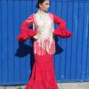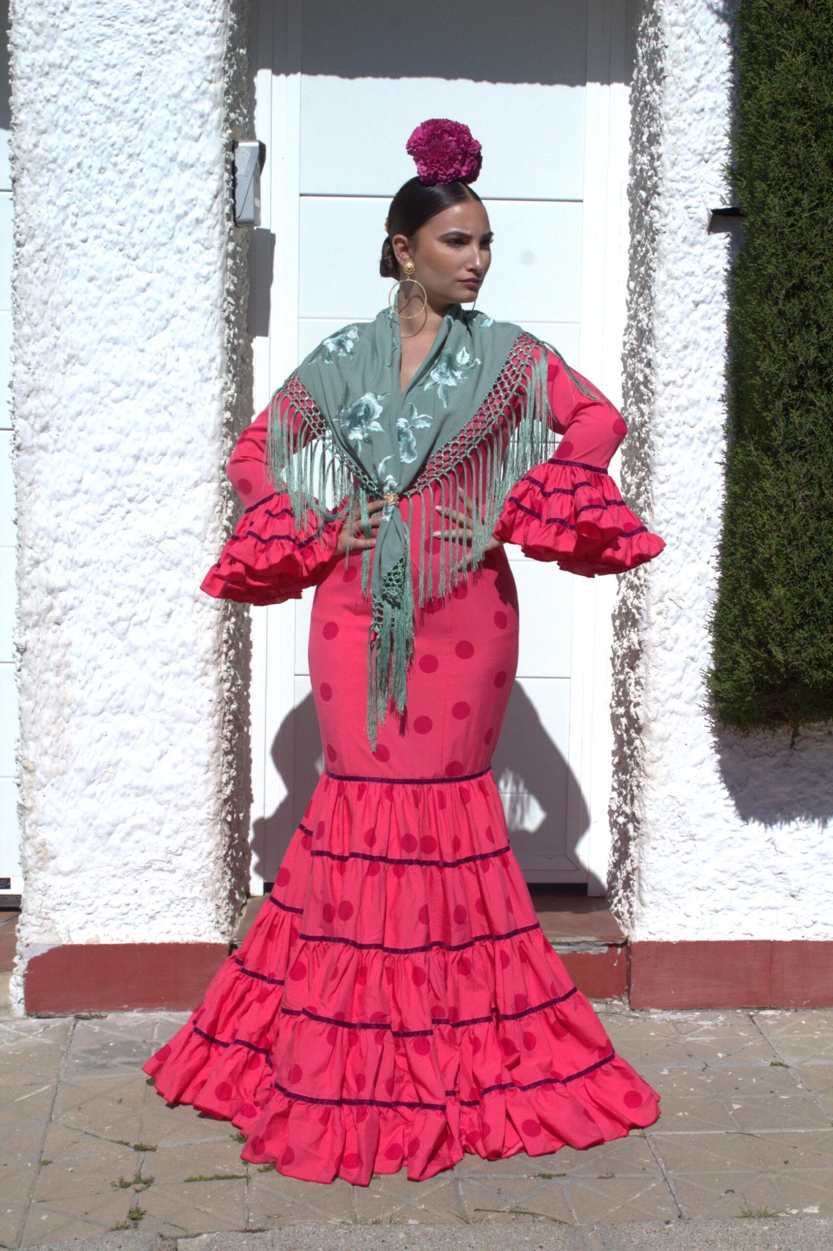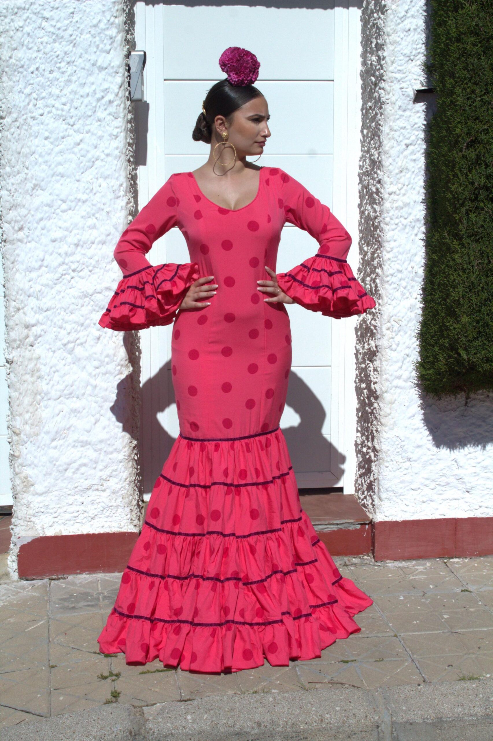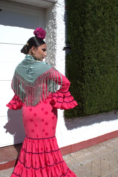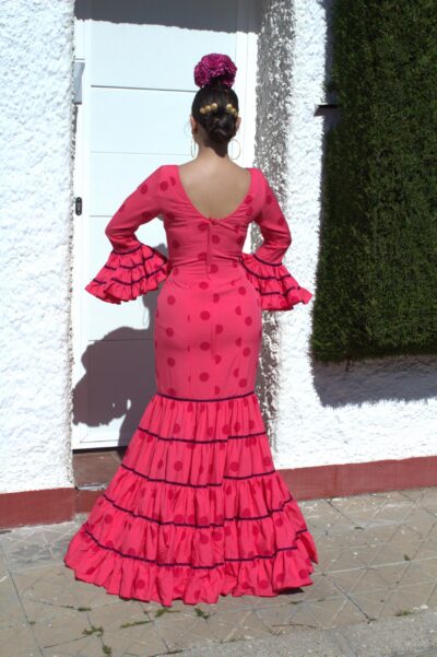 Traje de flamenca de canastero de lunares con cintas de terciopelo.