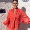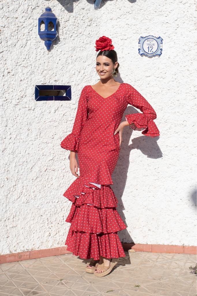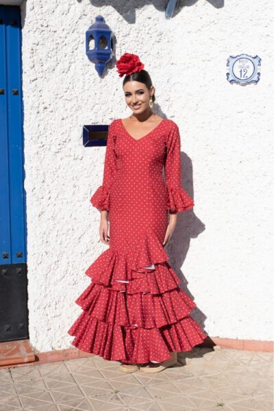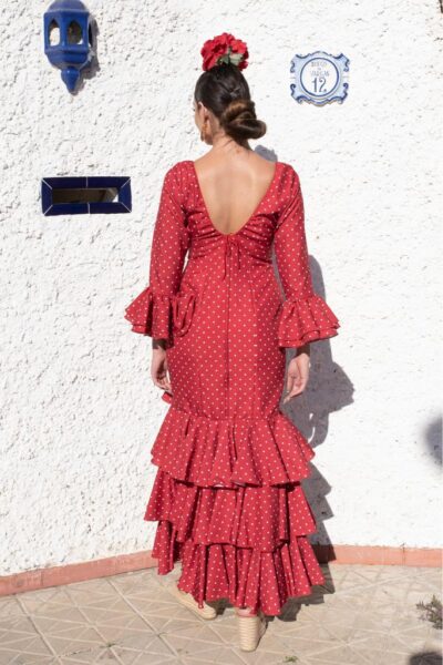 Traje de flamenca de 4 volantes con subida. Media manga con volantes dobles.