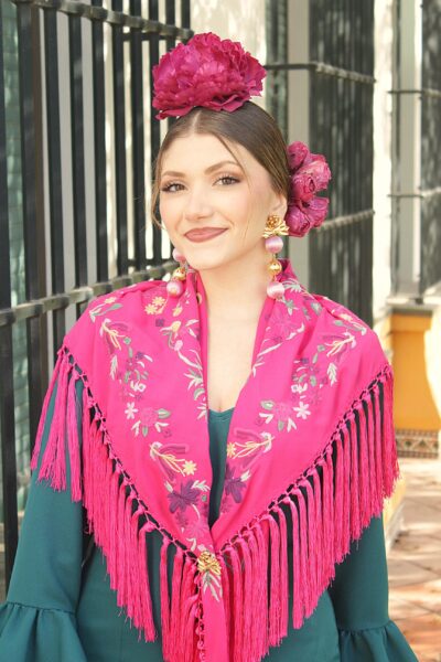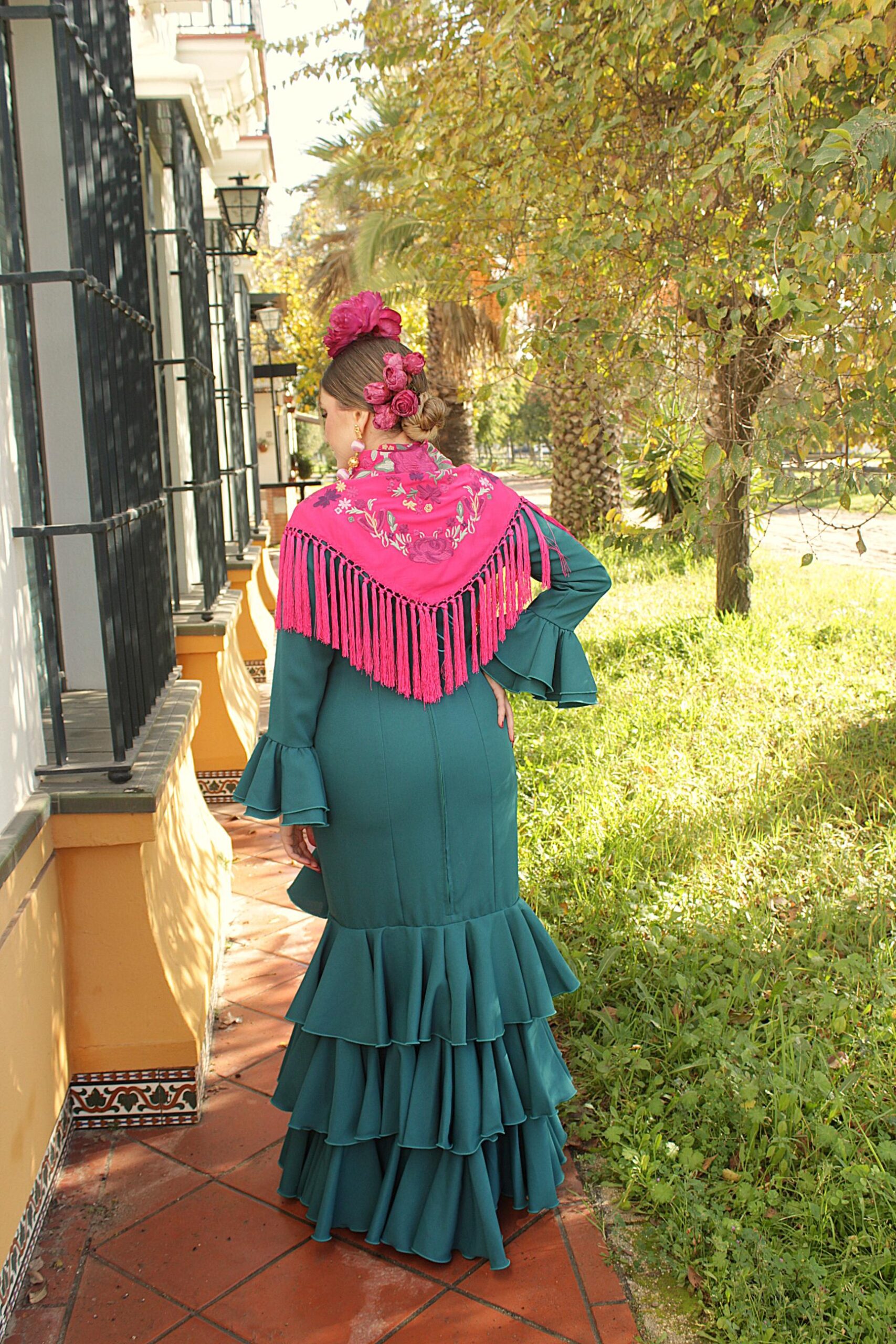 Traje de flamenca de 4 volantes con subida. Media manga con volantes dobles.