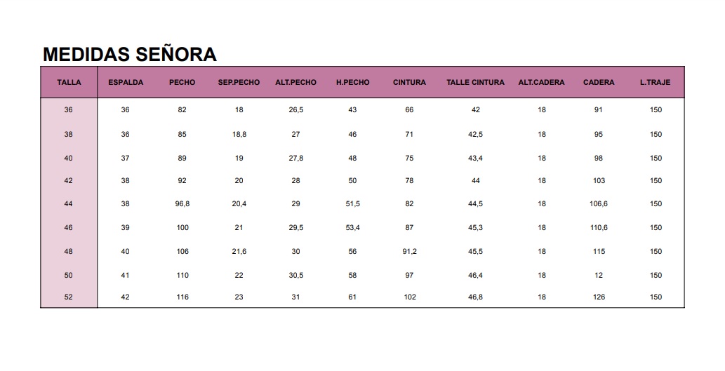 | Talla | 34, 36, 38, 40, 42, 44, 46, 48, 50, 52 |