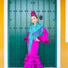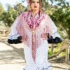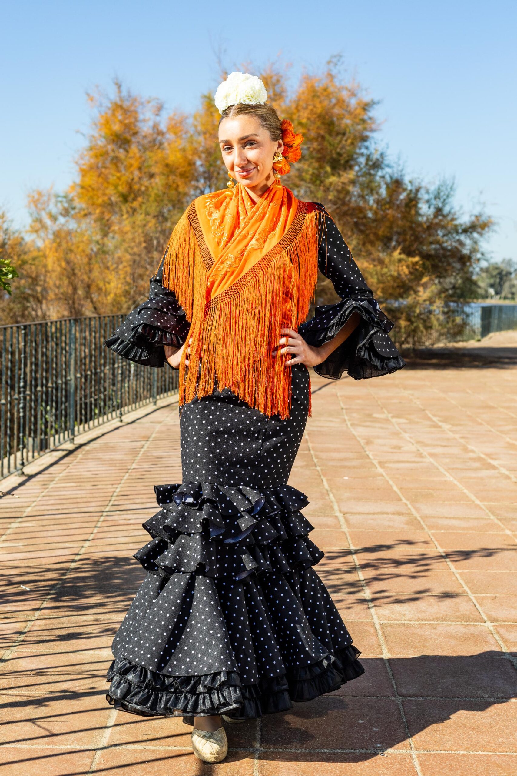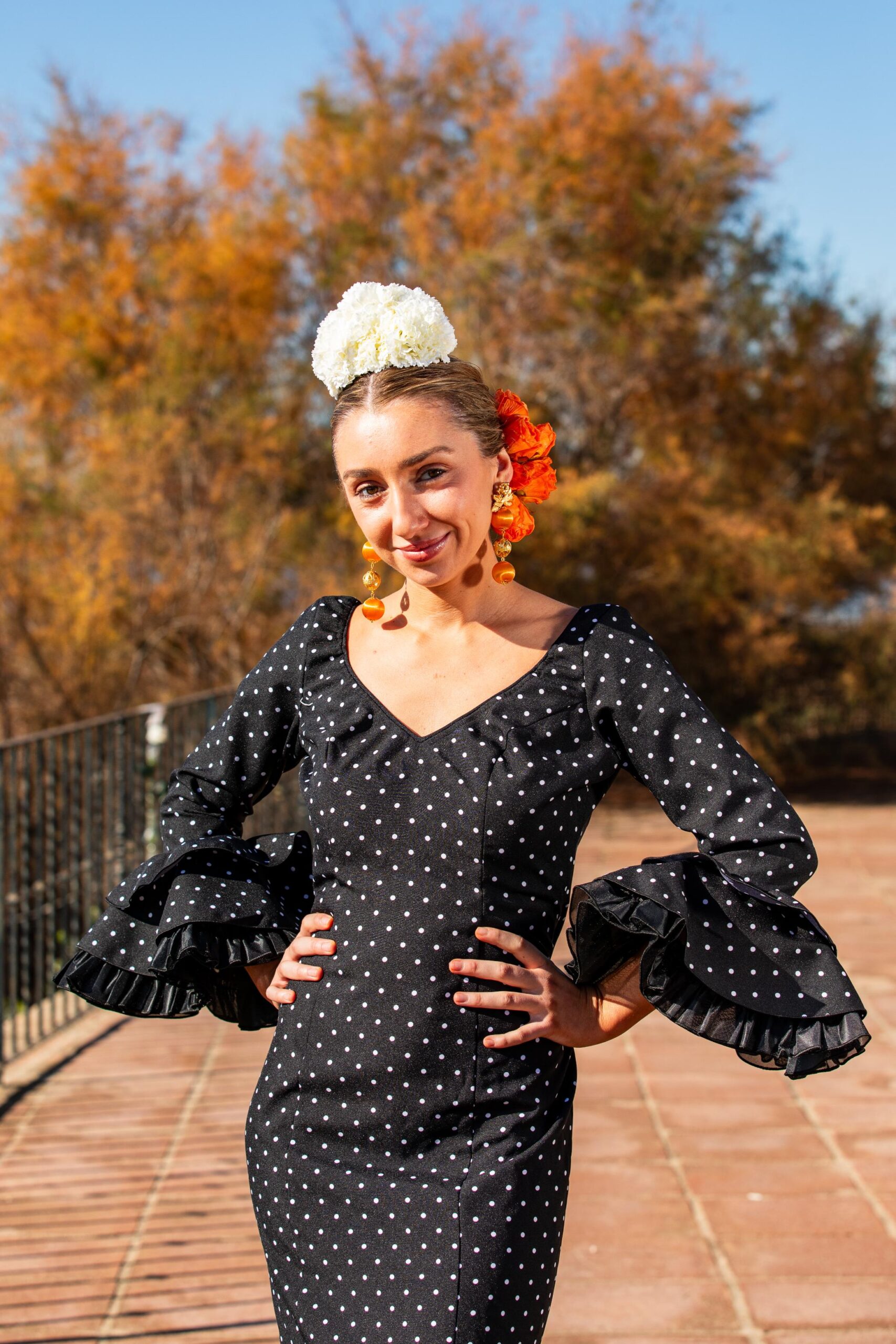Trajes de flamenca Rocío Negro de lunares Blancos
