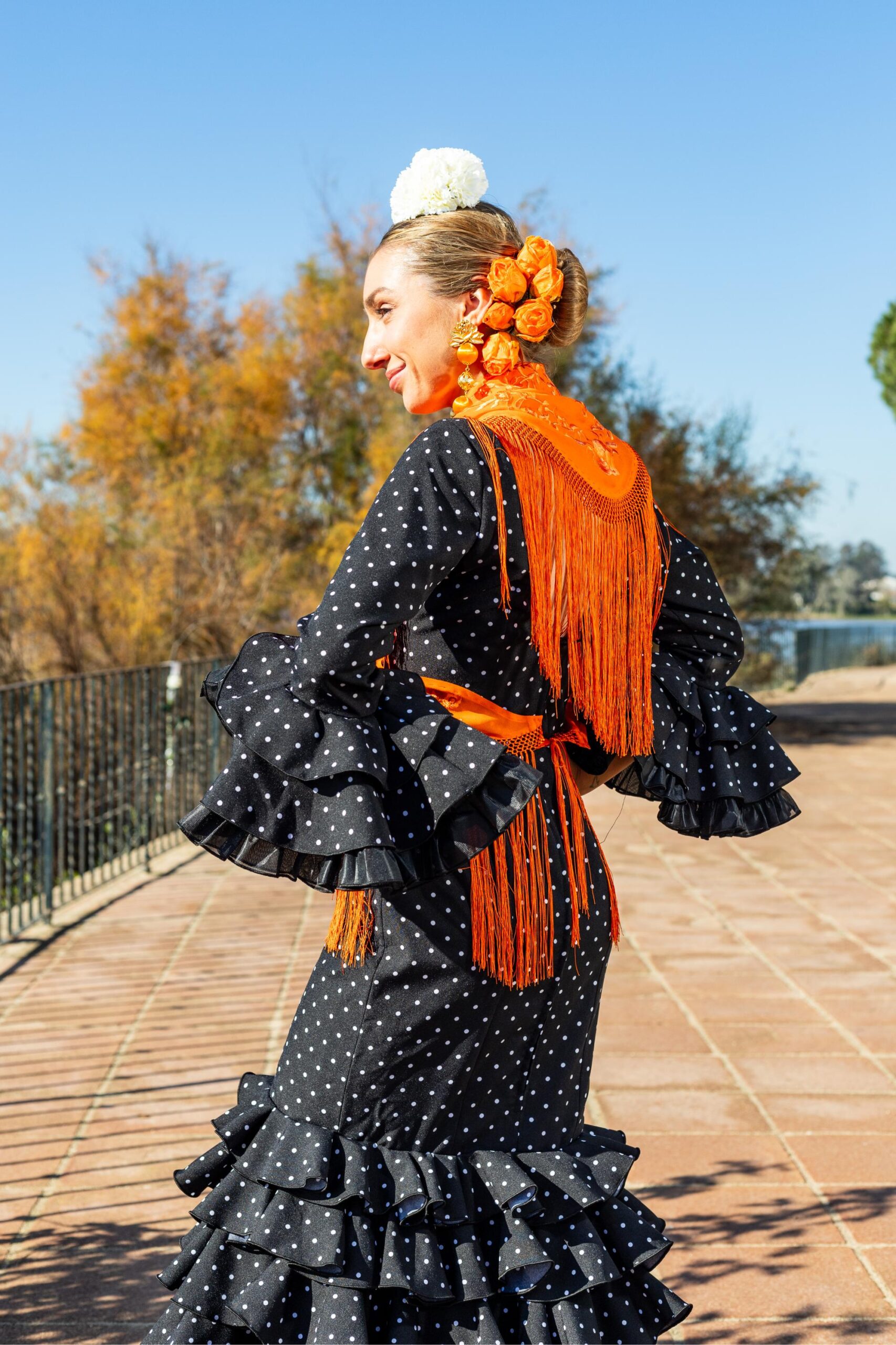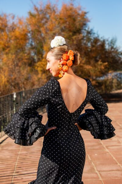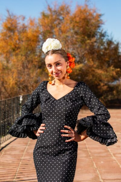 Traje de flamenca Cayetana Negro con Lunar Blanco