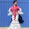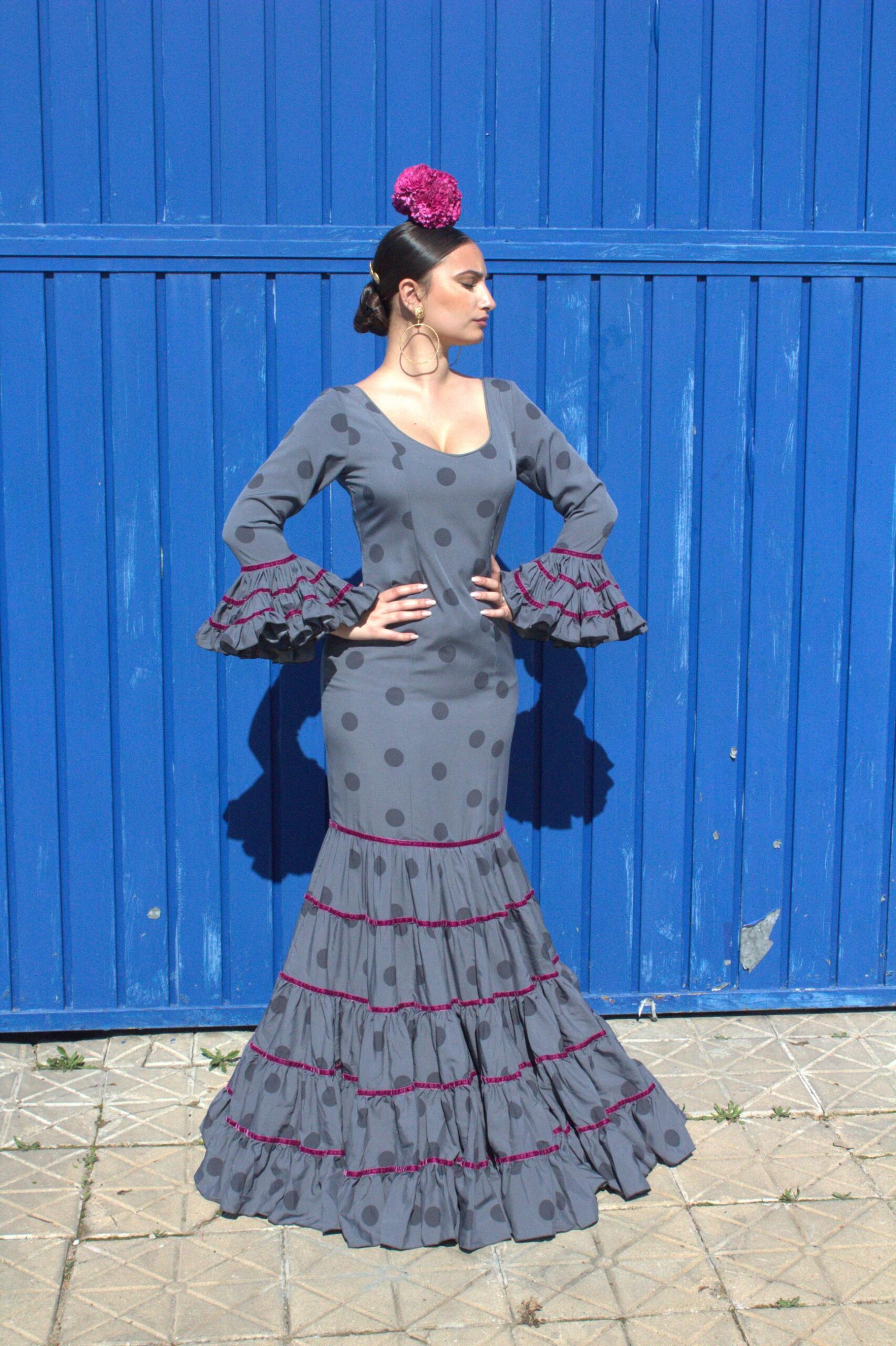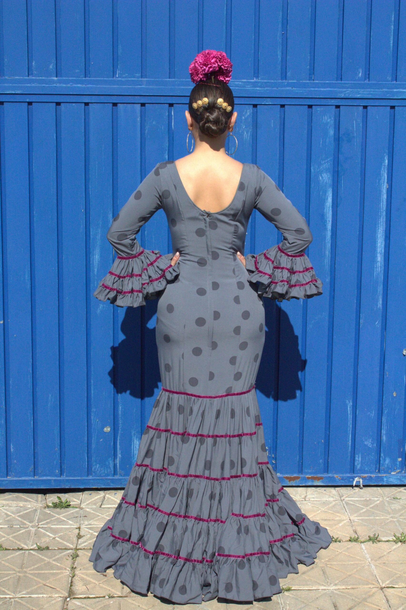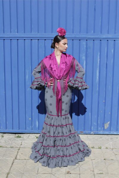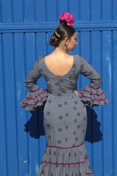 Traje de flamenca de canastero de lunares con cinta de terciopelo.